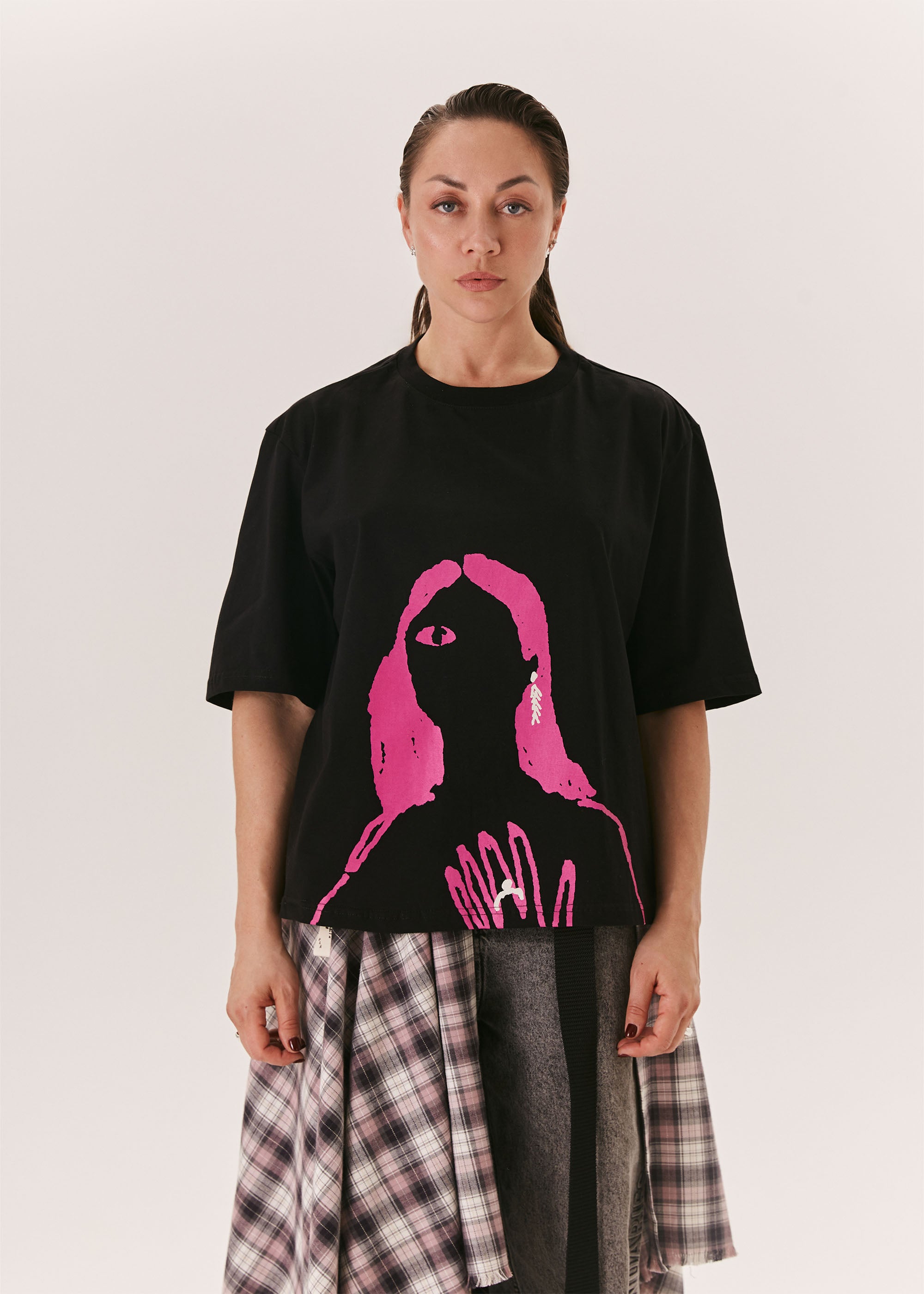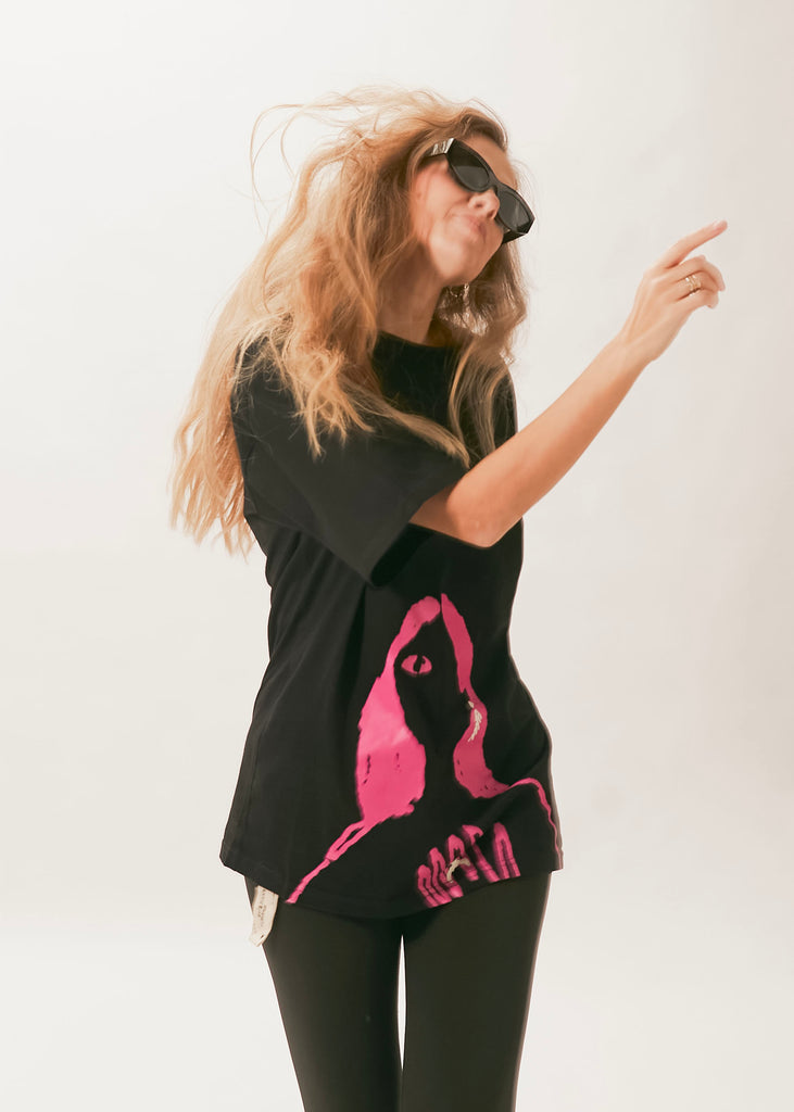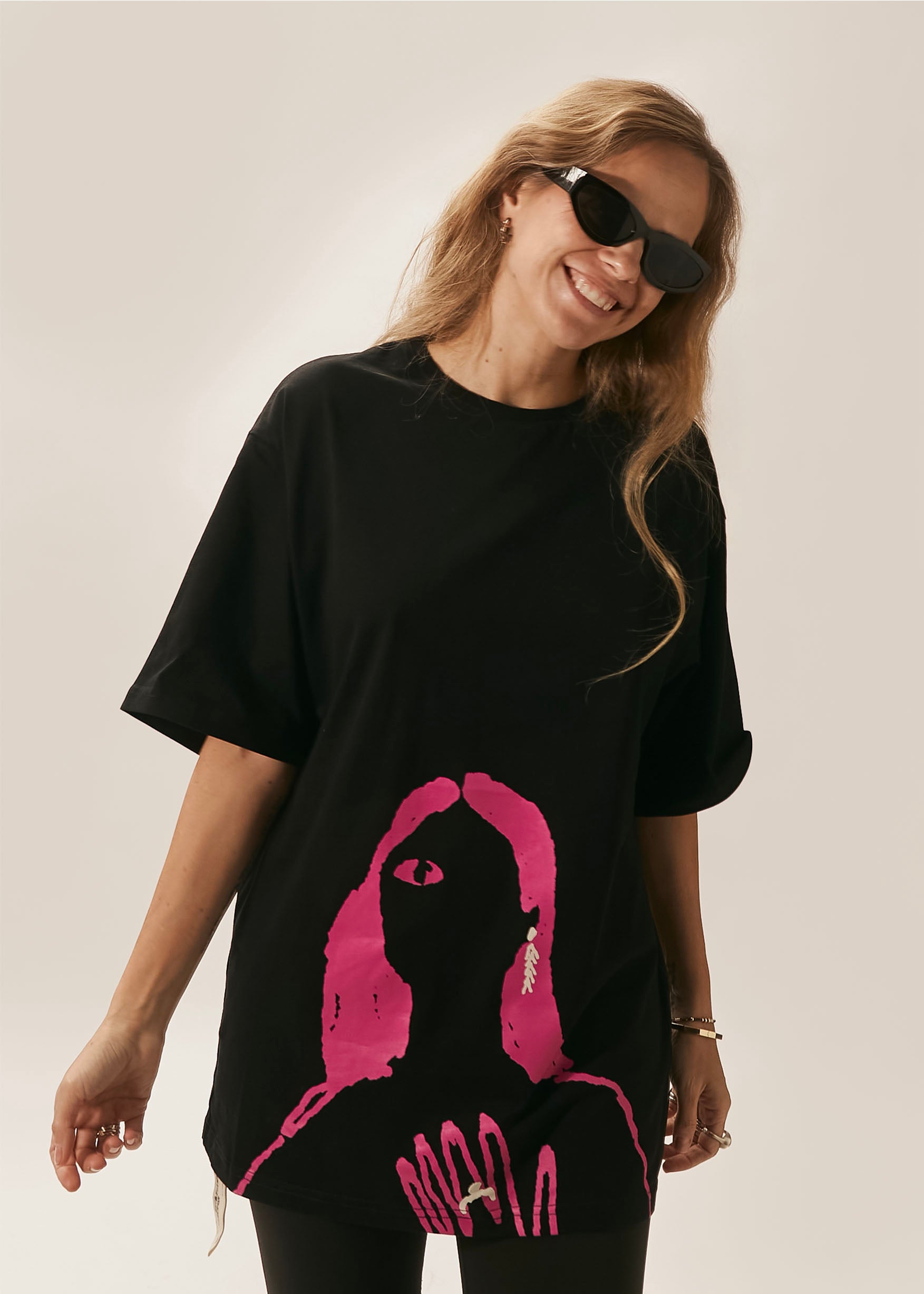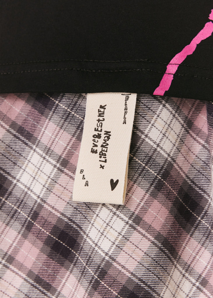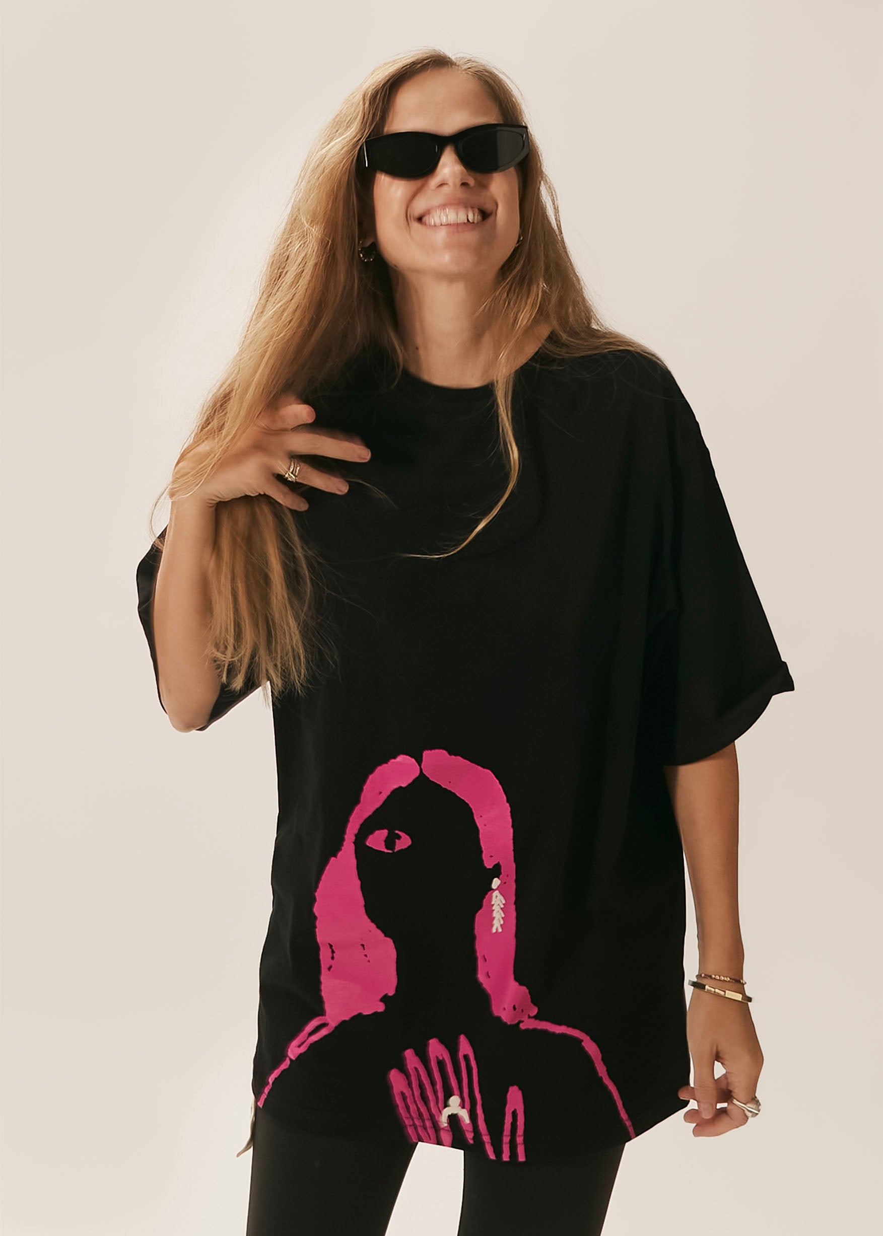 A long, relaxed-fit black T-shirt with an exclusive print from the EVE&ESTHER x LIBERMAN collaboration, perfectly pairs with both trousers and skirts.