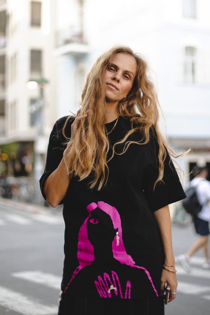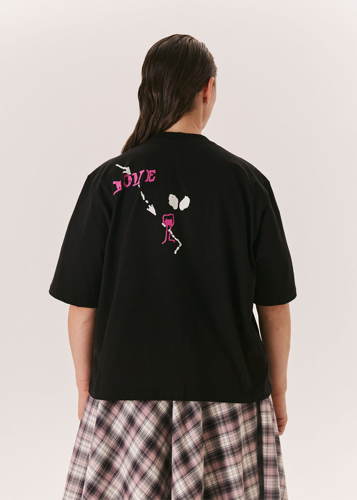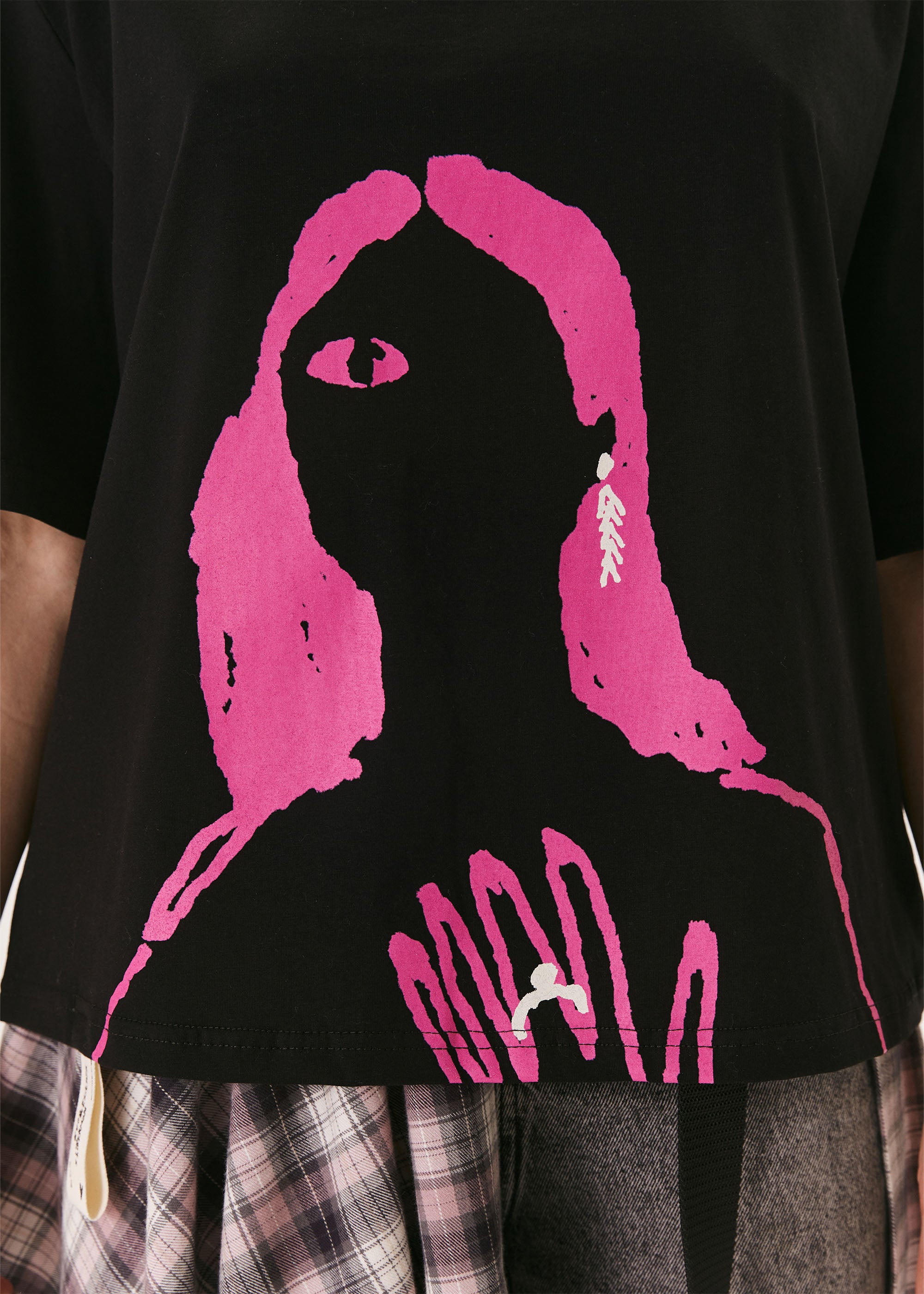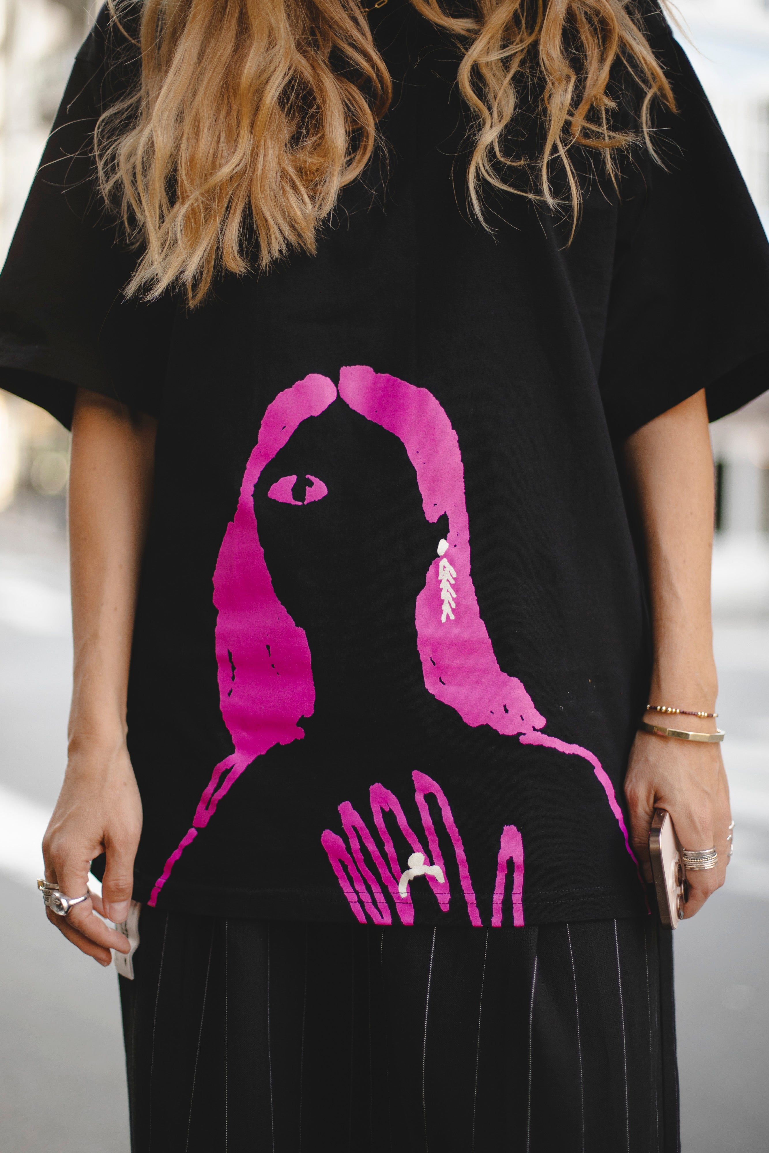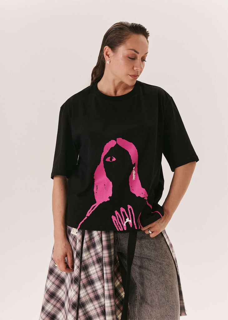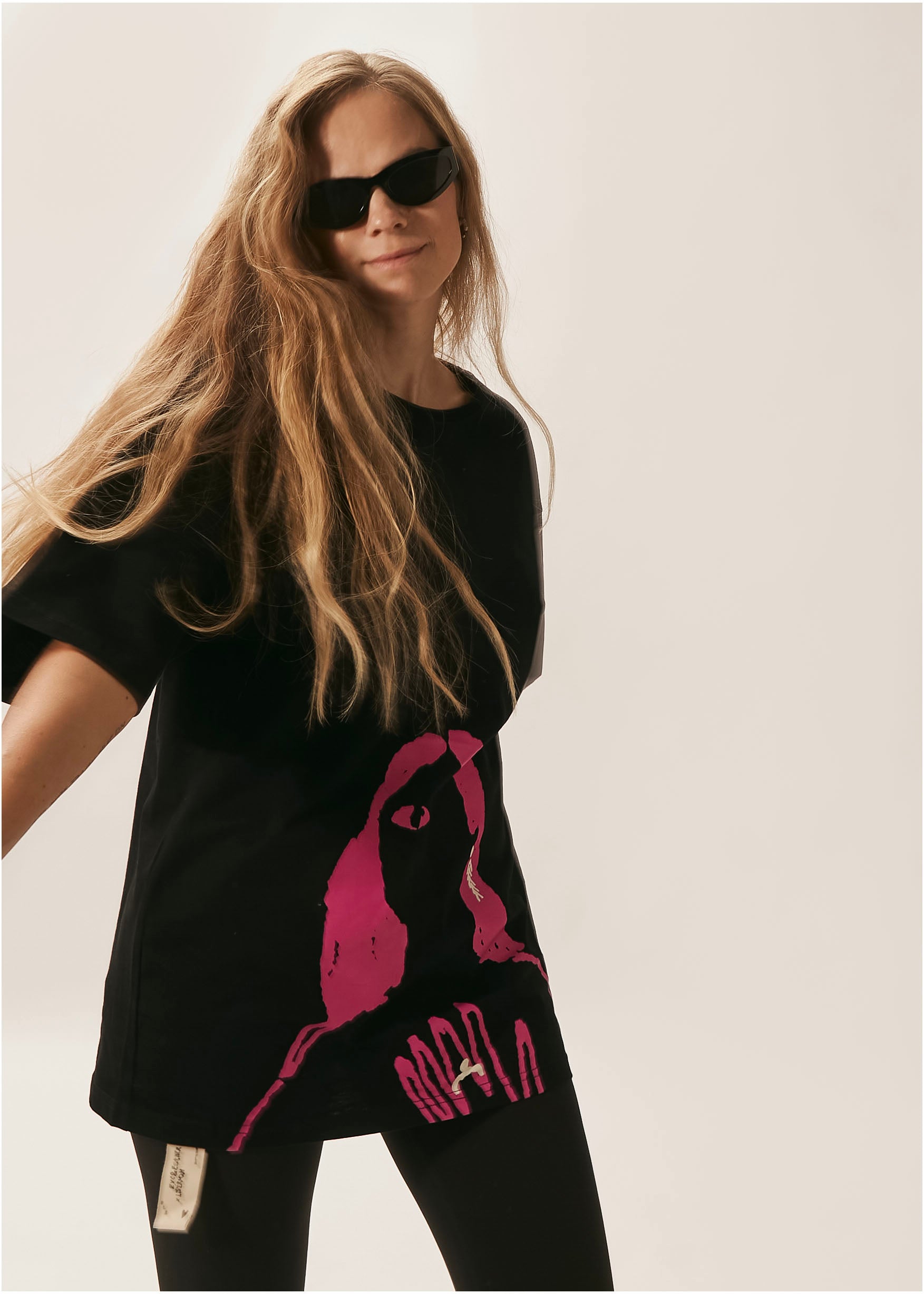 A long, relaxed-fit black T-shirt with an exclusive print from the EVE&ESTHER x LIBERMAN collaboration, perfectly pairs with both trousers and skirts.