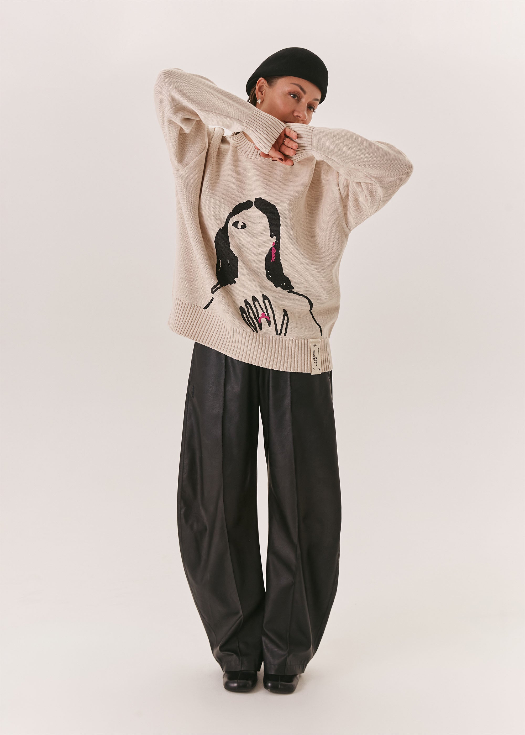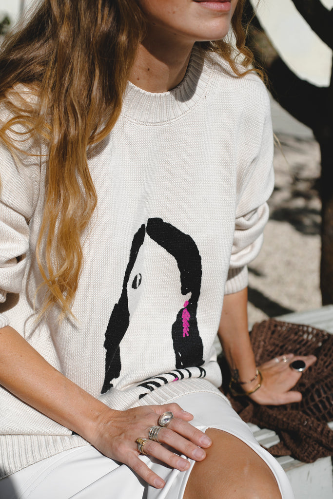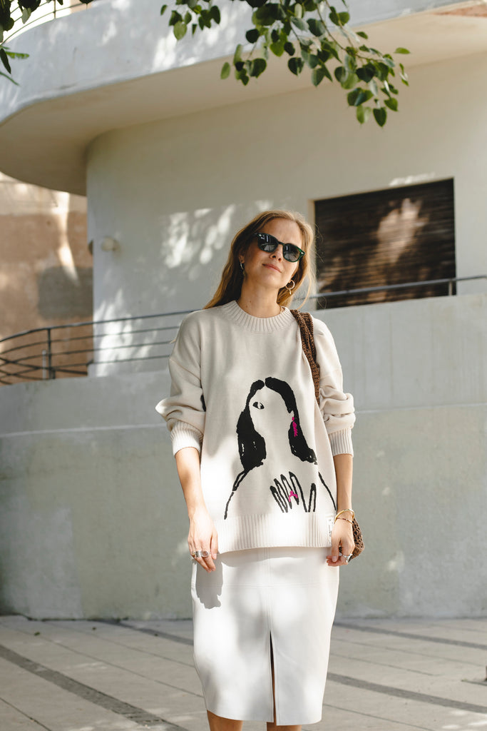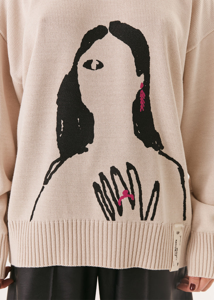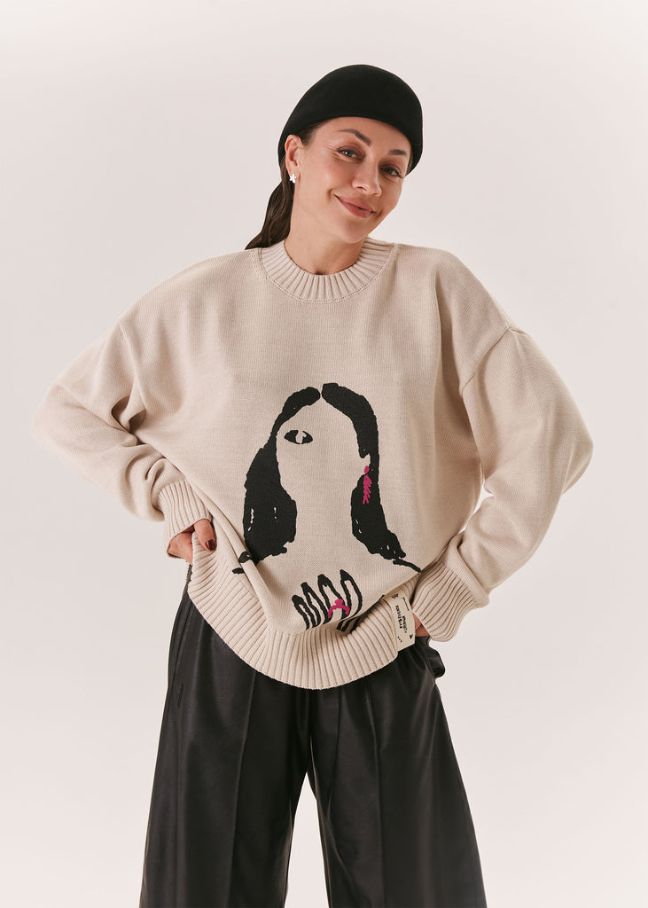 A relaxed-fit milky sweater made from a cotton-acrylic blend, featuring a signature print from the EVE&ESTHER x LIBERMAN collaboration. The slightly dropped shoulder line creates a soft, streamlined silhouette.