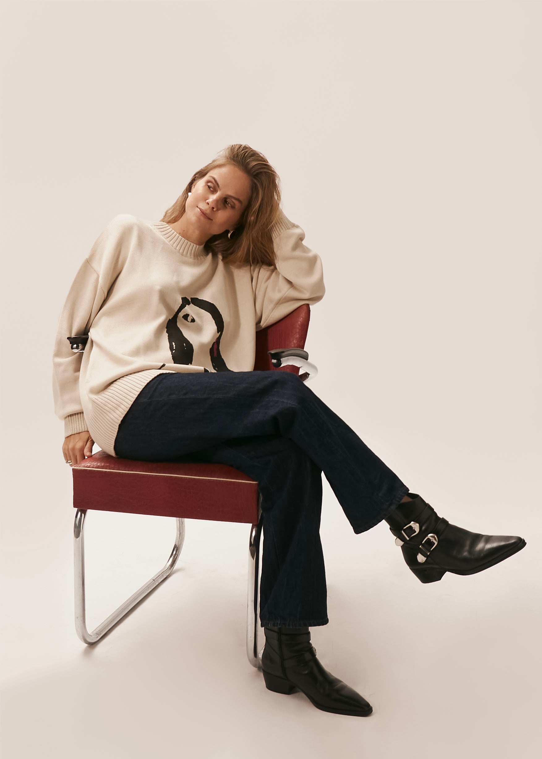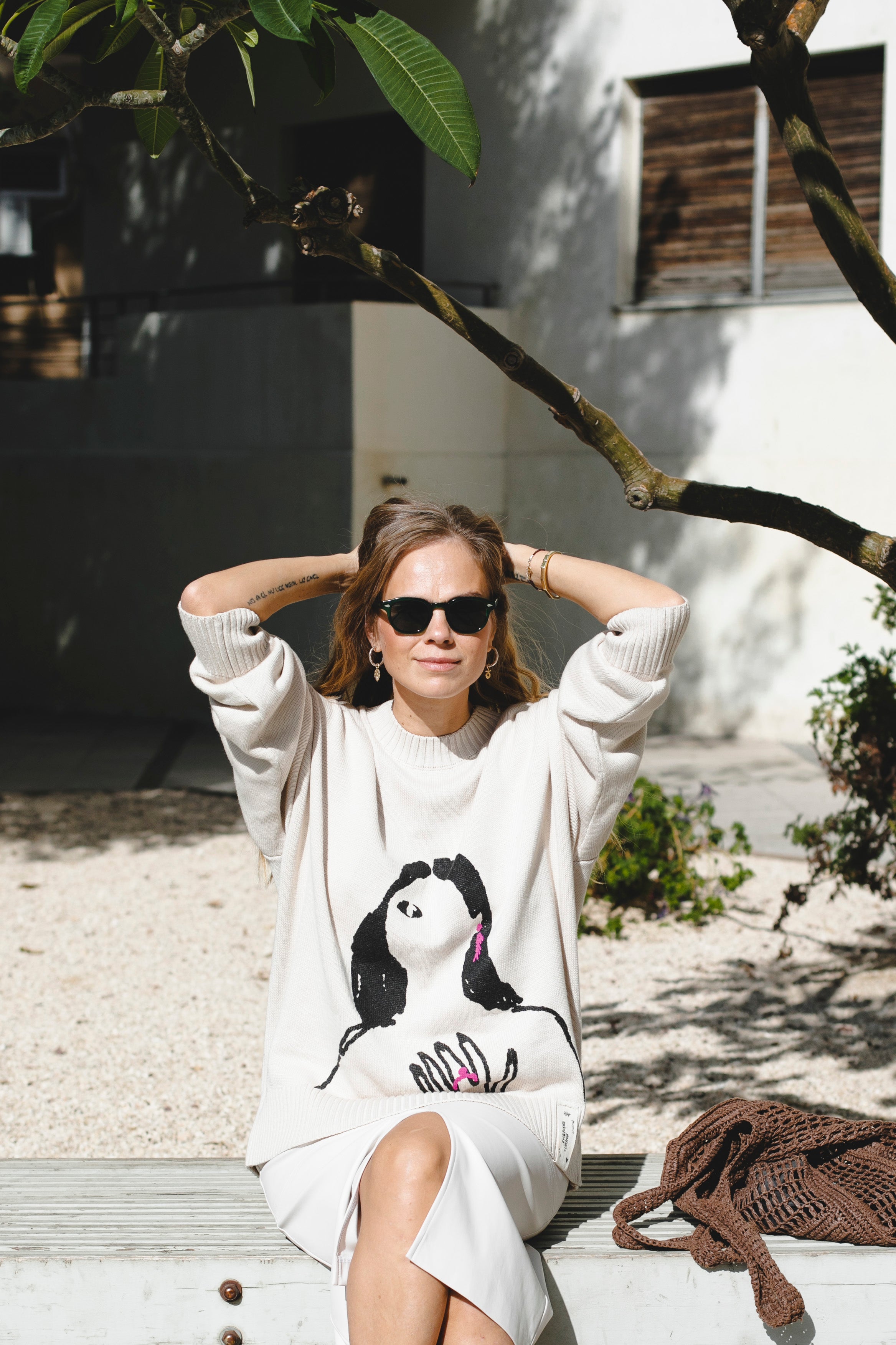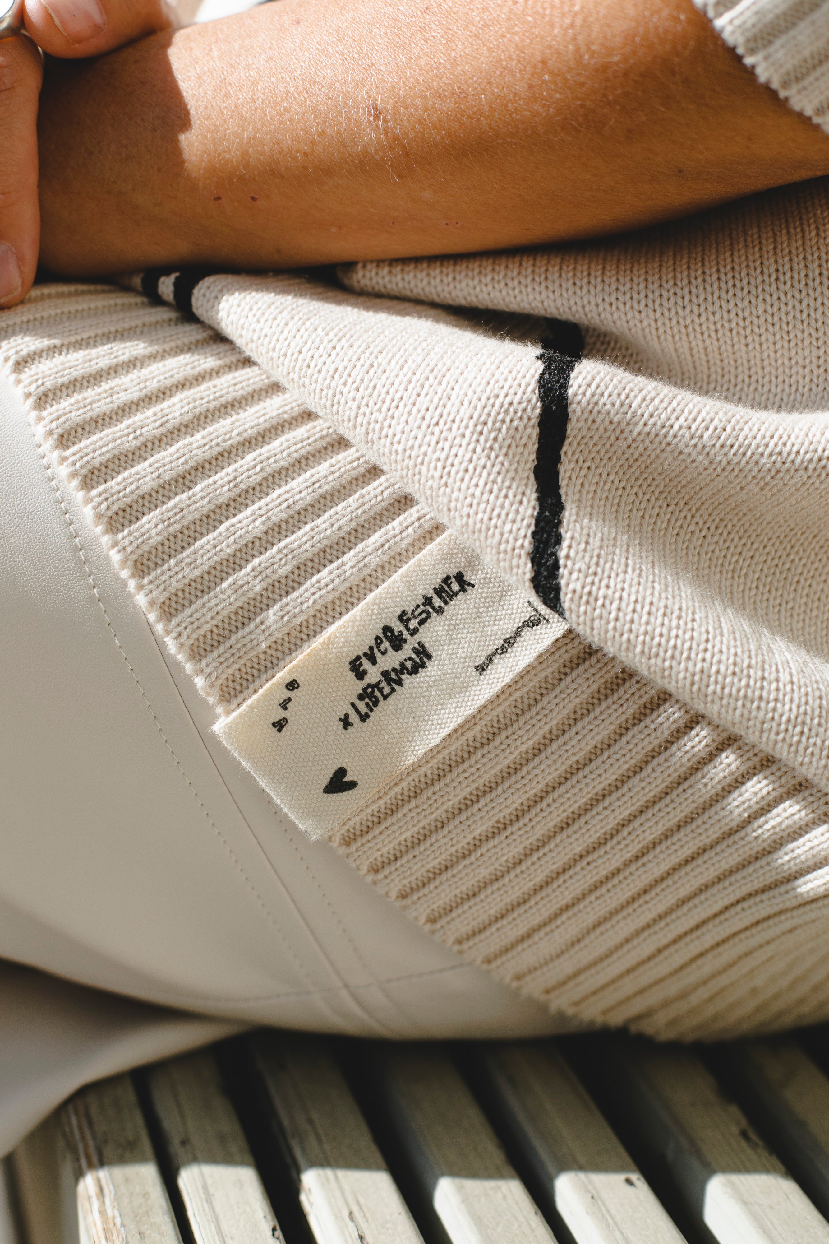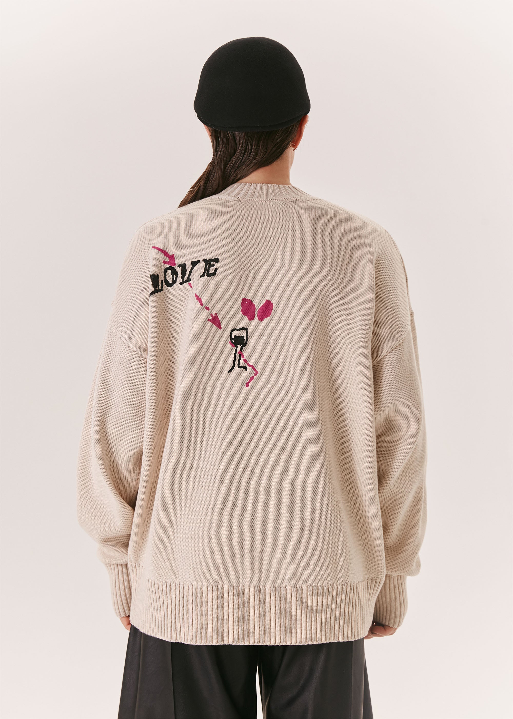 A relaxed-fit milky sweater made from a cotton-acrylic blend, featuring a signature print from the EVE&ESTHER x LIBERMAN collaboration. The slightly dropped shoulder line creates a soft, streamlined silhouette.