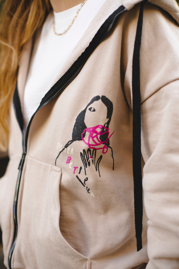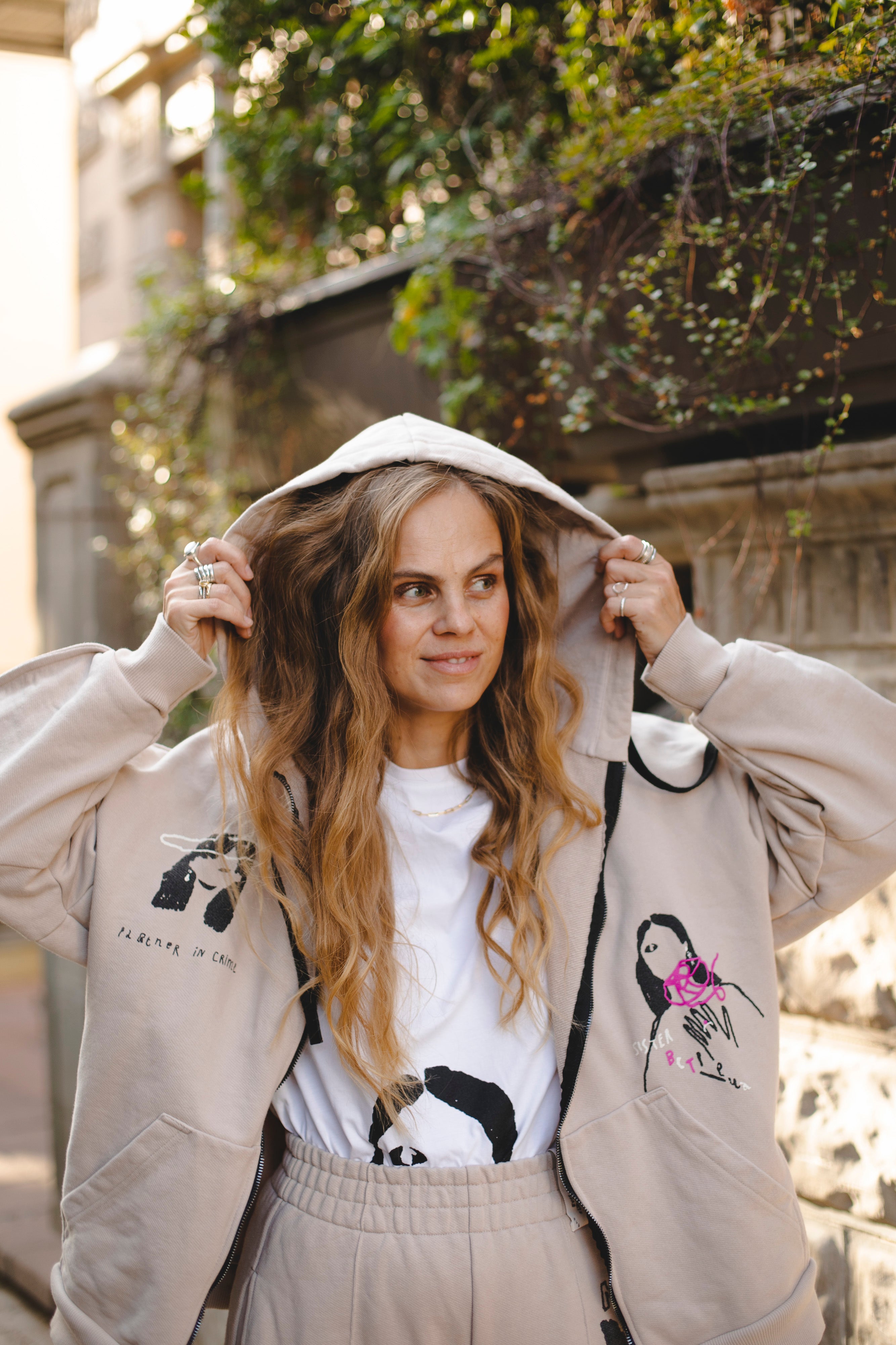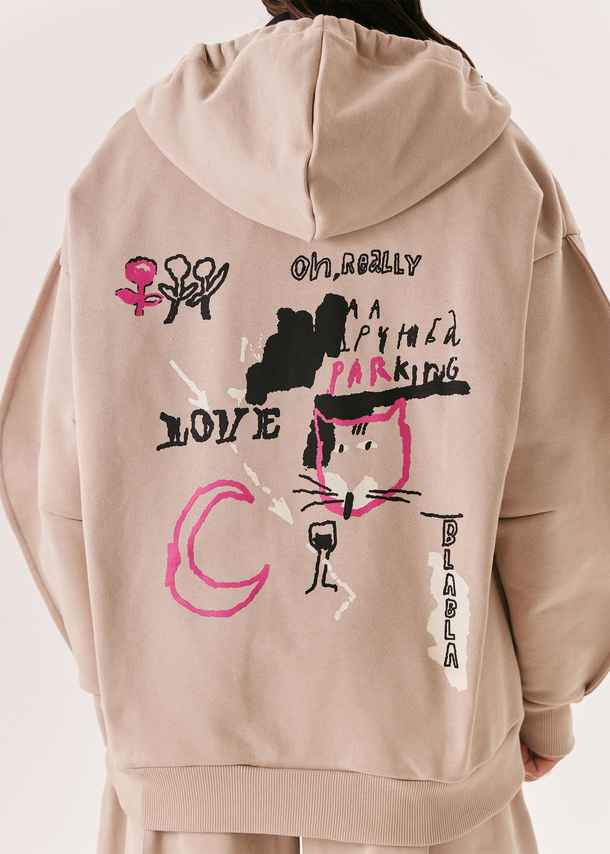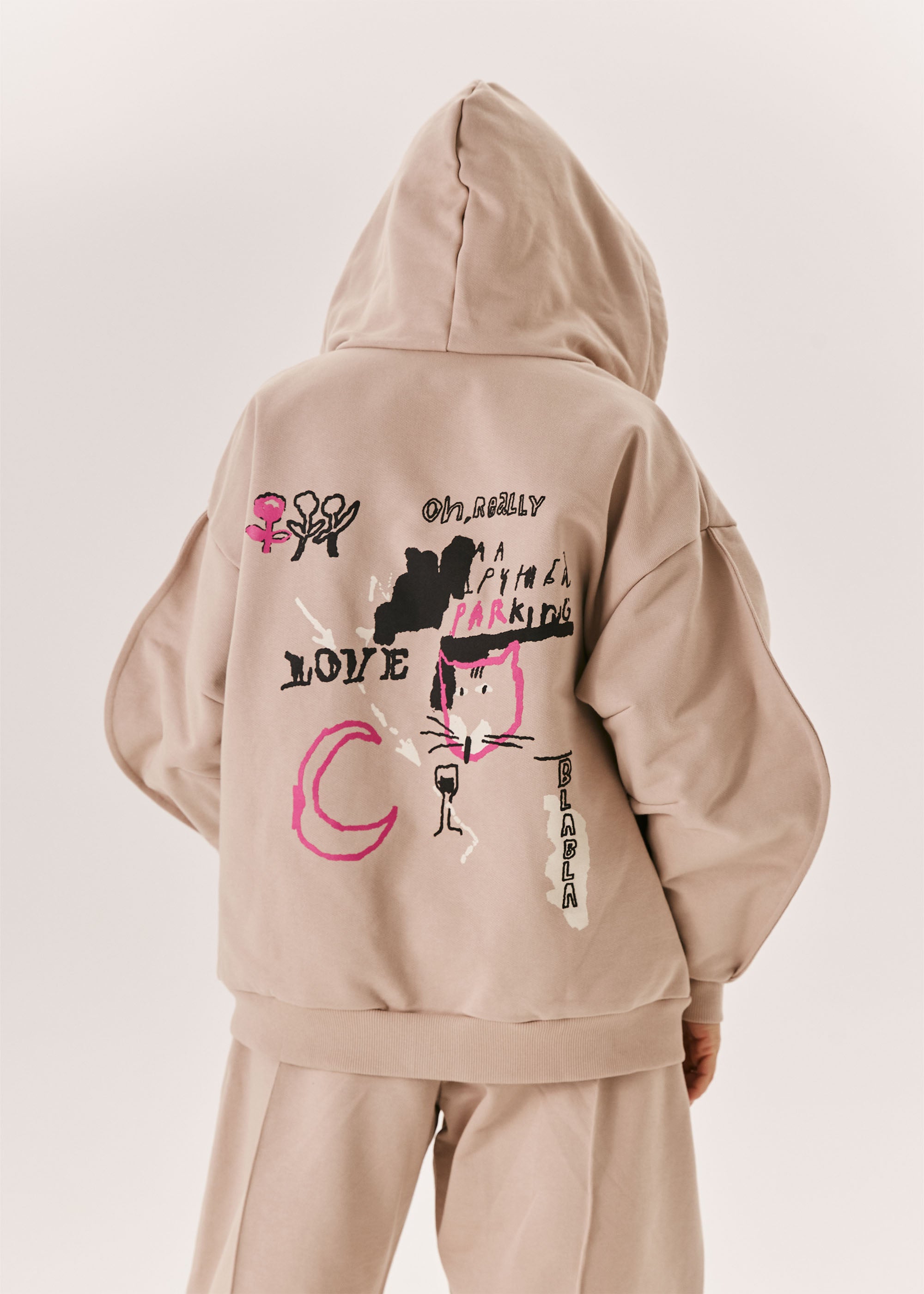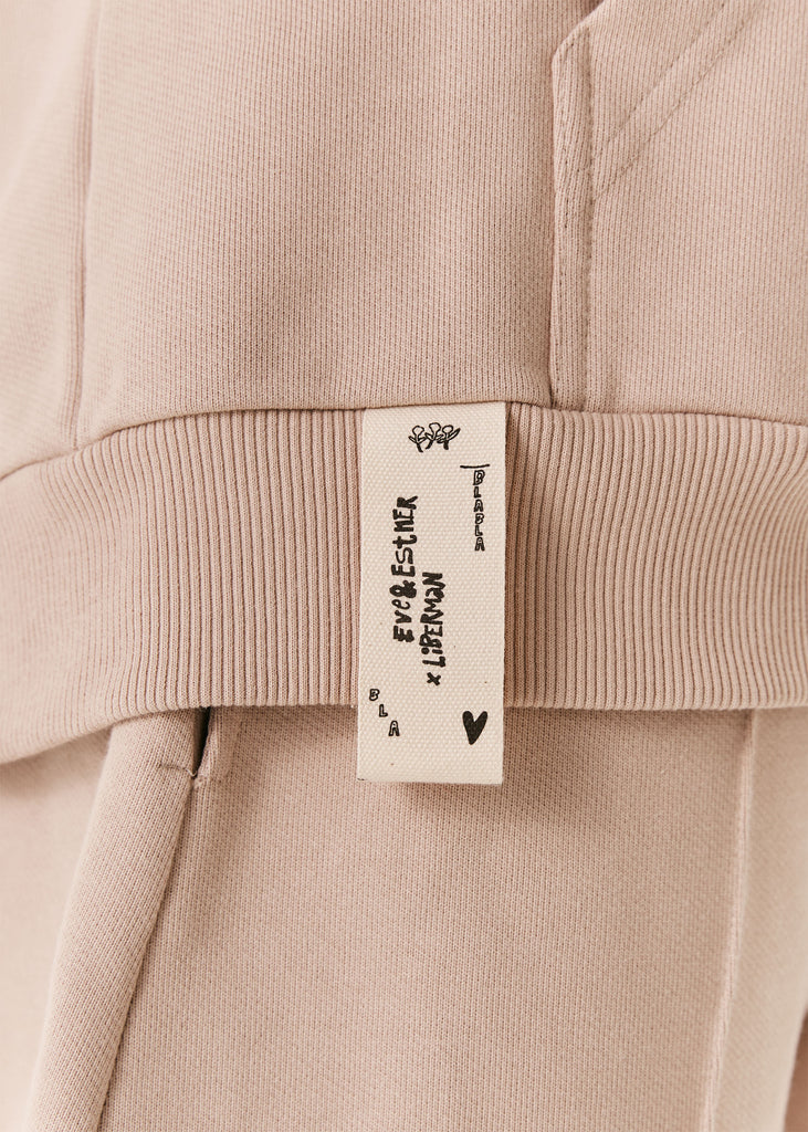 A straight-cut hoodie made from soft beige knit fabric, featuring a hood and a kangaroo pocket, complemented by functional details, an original print and a decorative patch from the EVE&ESTHER x LIBERMAN collaboration.