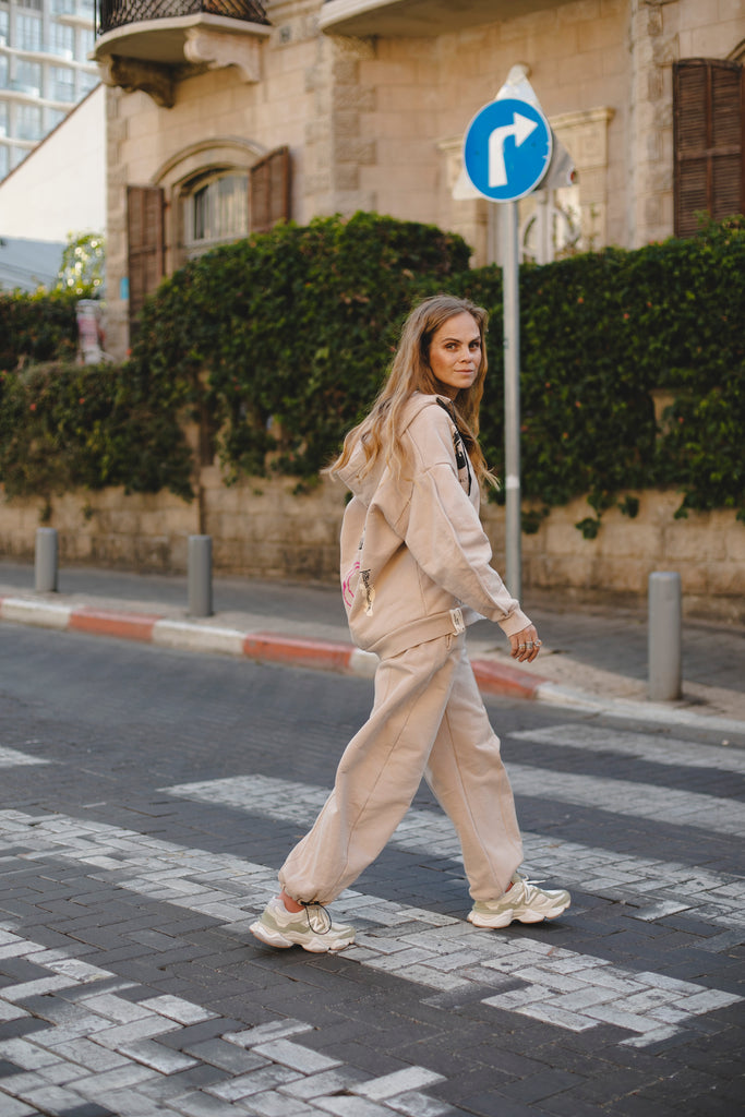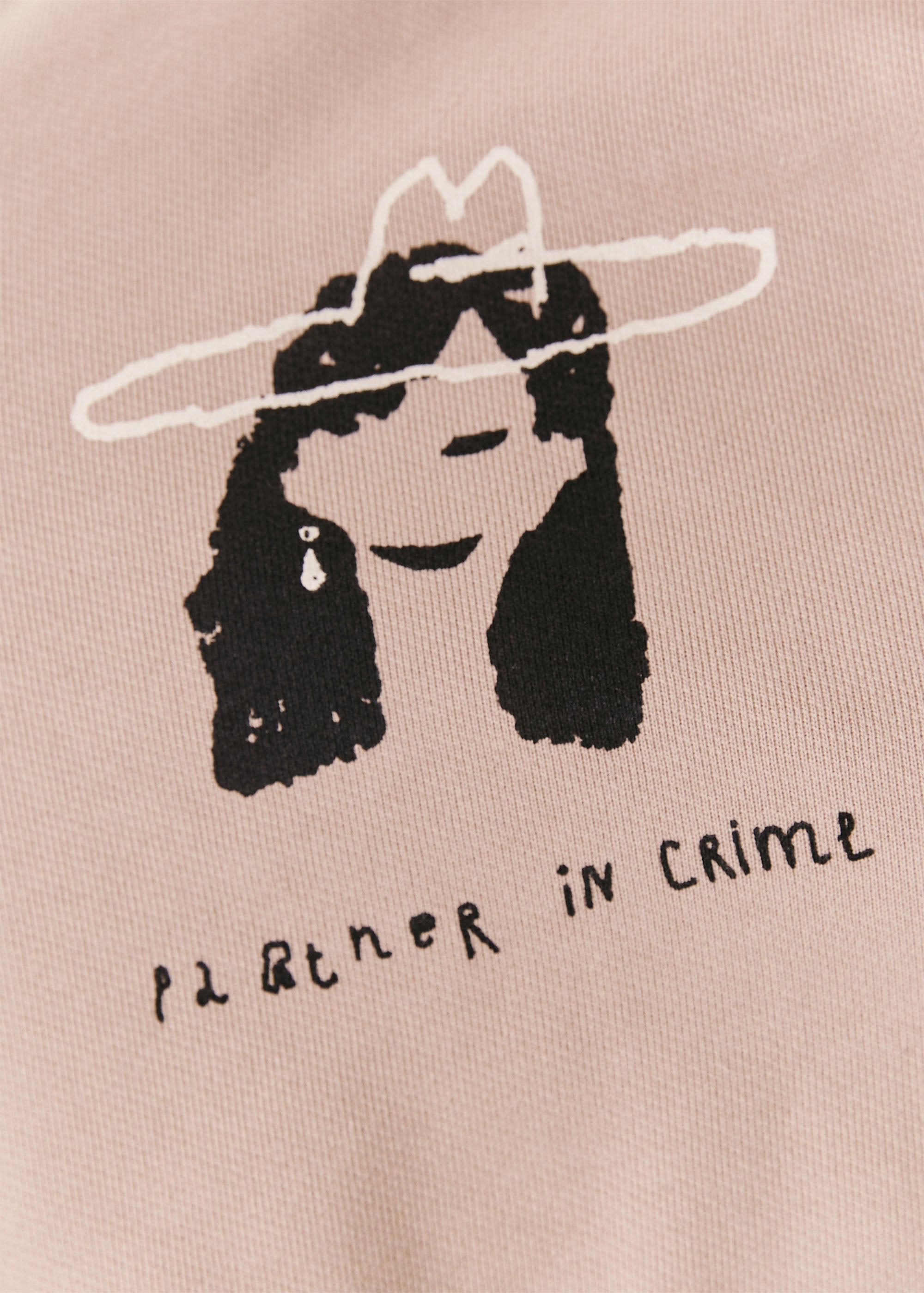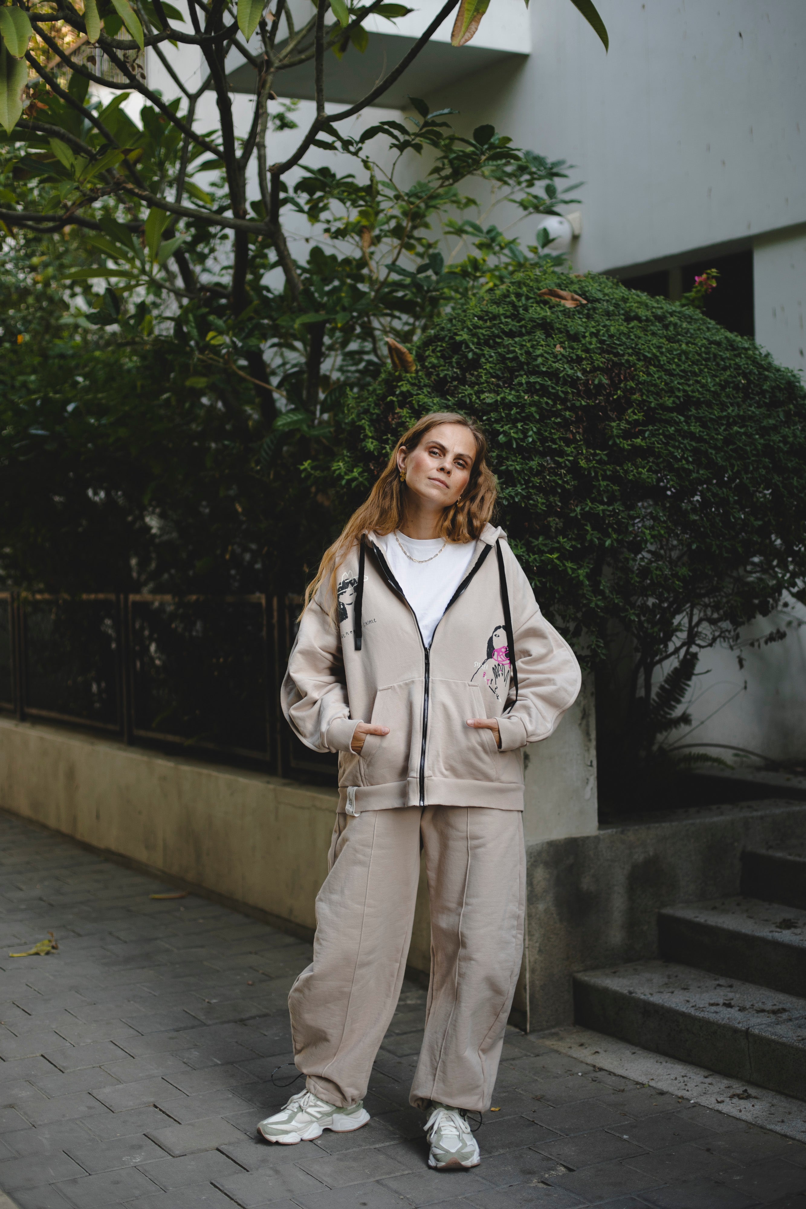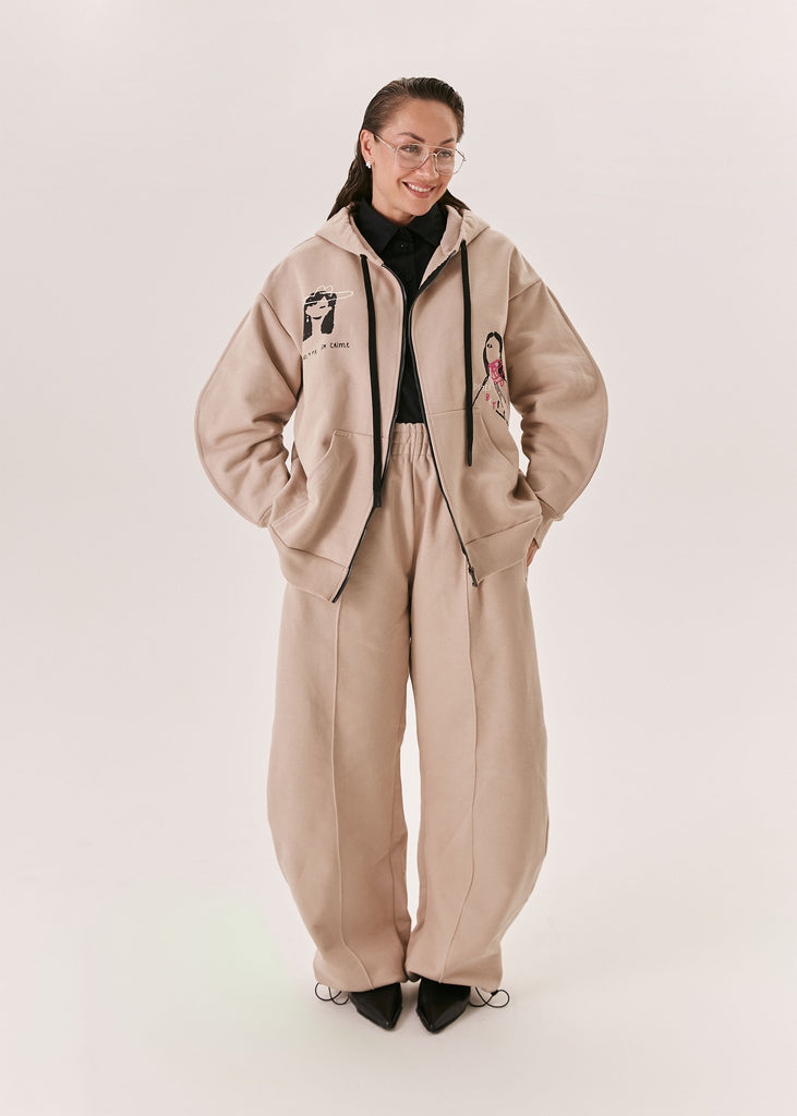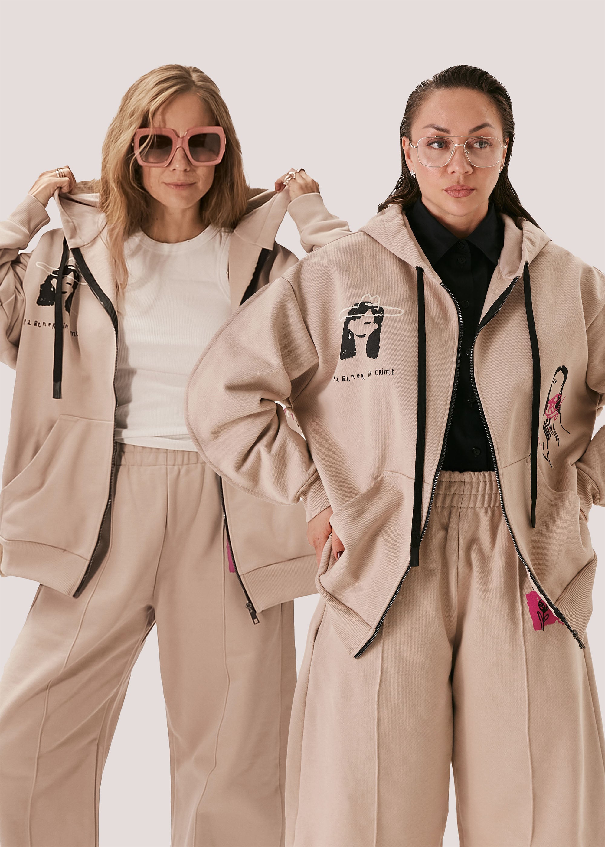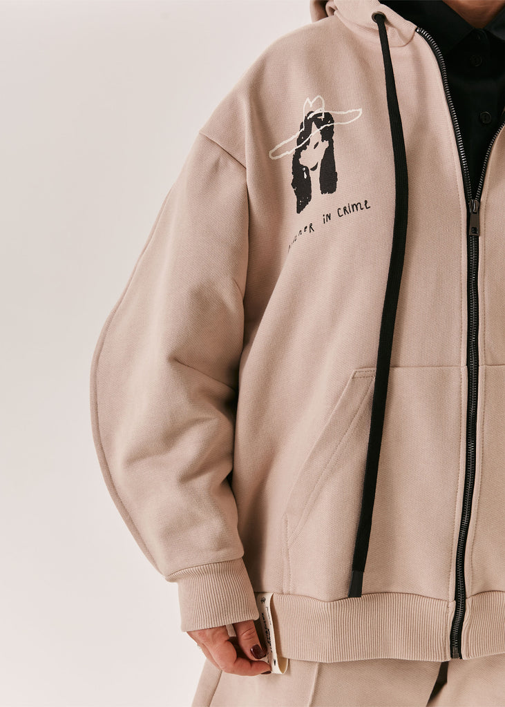 A straight-cut hoodie made from soft beige knit fabric, featuring a hood and a kangaroo pocket, complemented by functional details, an original print and a decorative patch from the EVE&ESTHER x LIBERMAN collaboration.