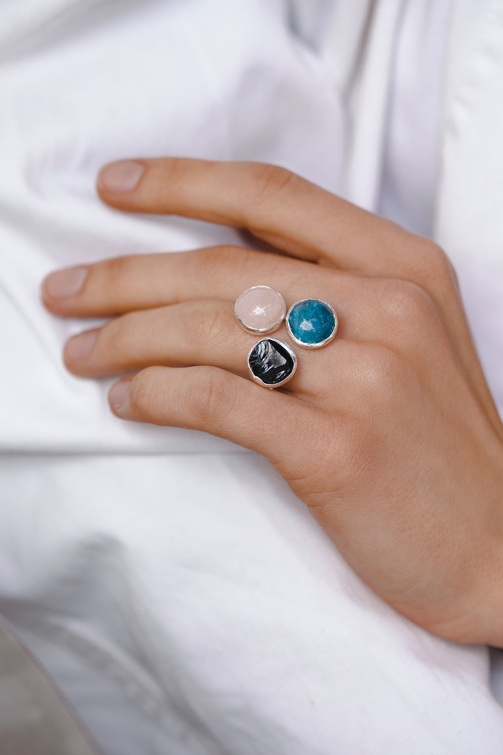 ring with natural semiprecious stones — apatite, spinel and rose quartz