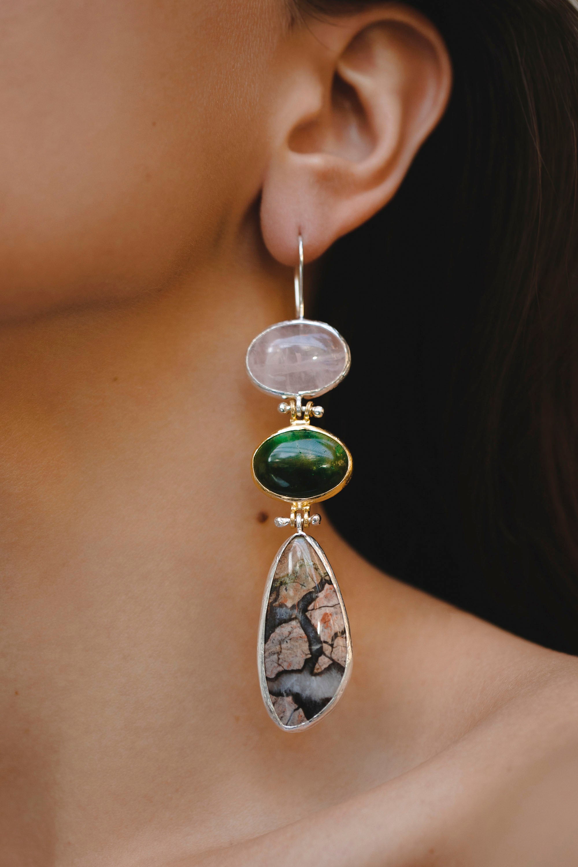 Black Agate, Rock Crystal, Cat's Eye Stone and Jasper Earrings