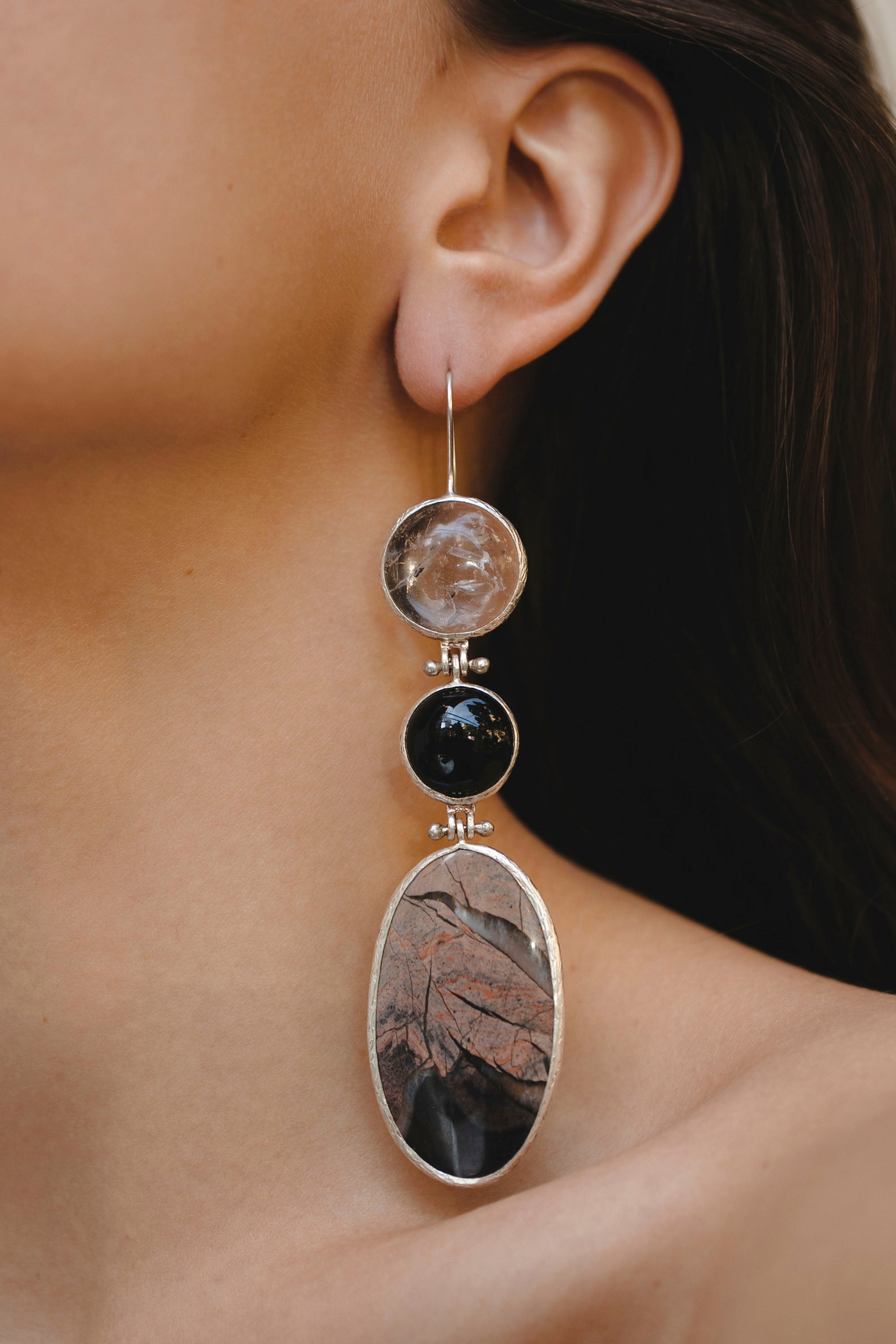 Rock Crystal, Black Agate and Jasper Earrings