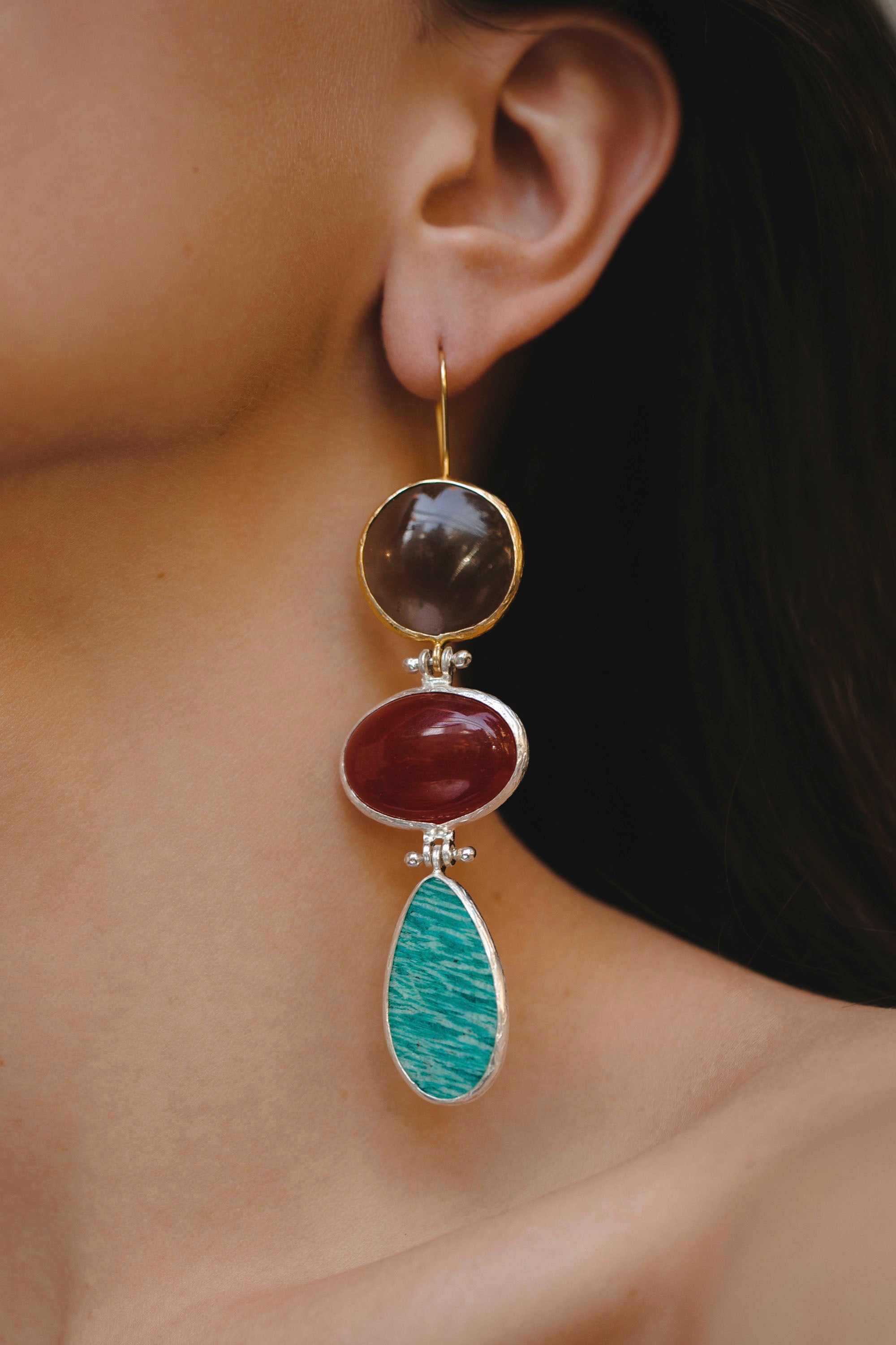 Smoky Quartz, Red Chalcedony and Amazonite Earrings