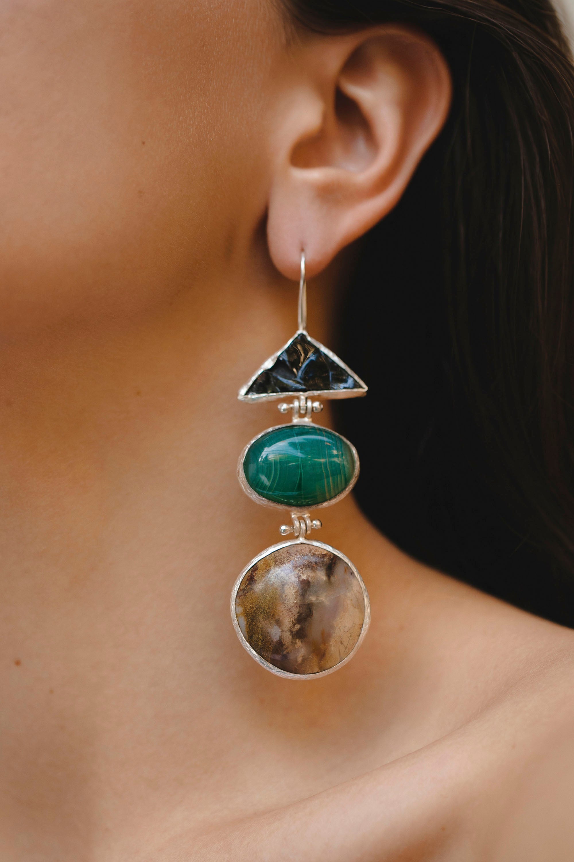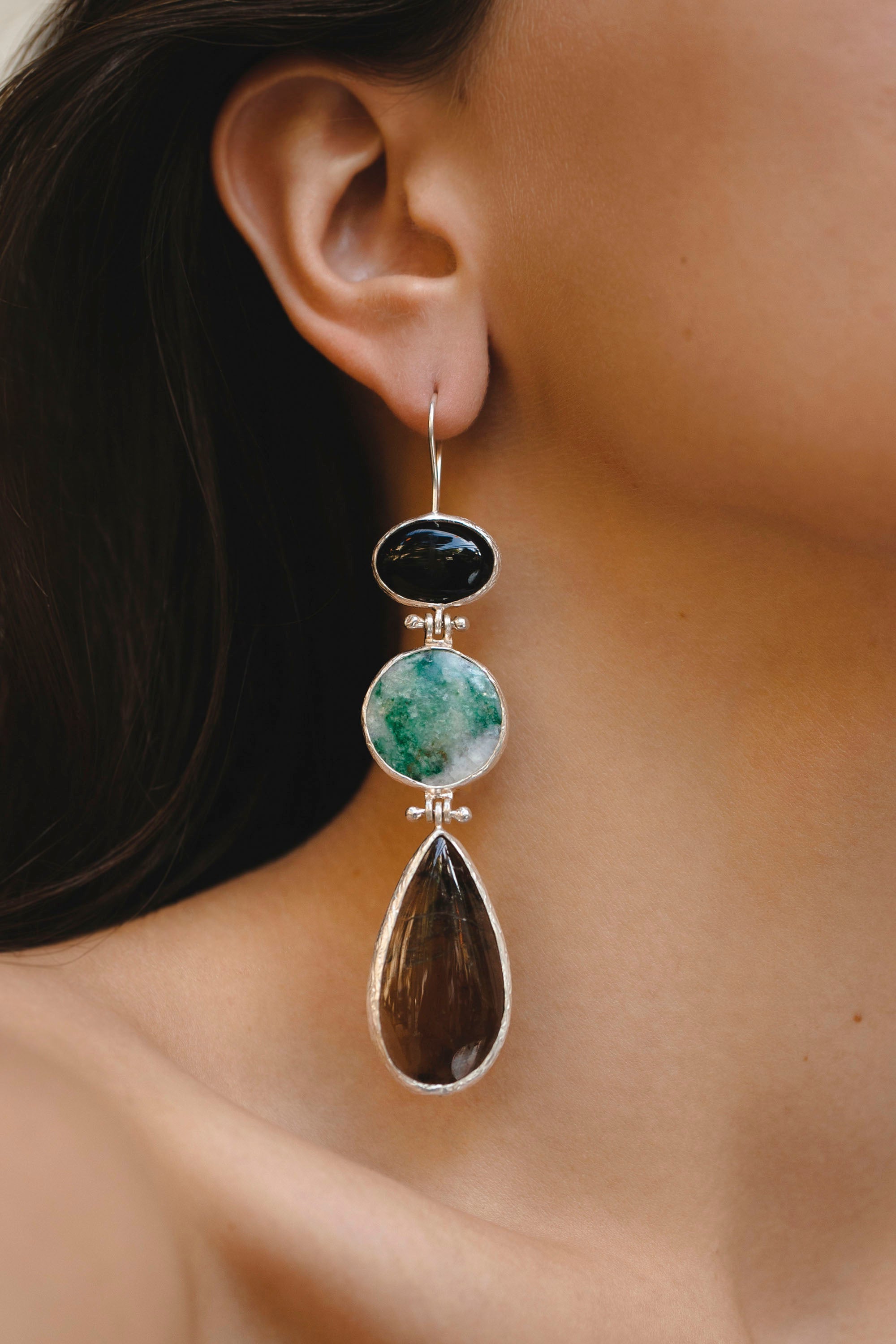 Spinel, Black Agate, Listvenite, Ophite and Agate Earrings