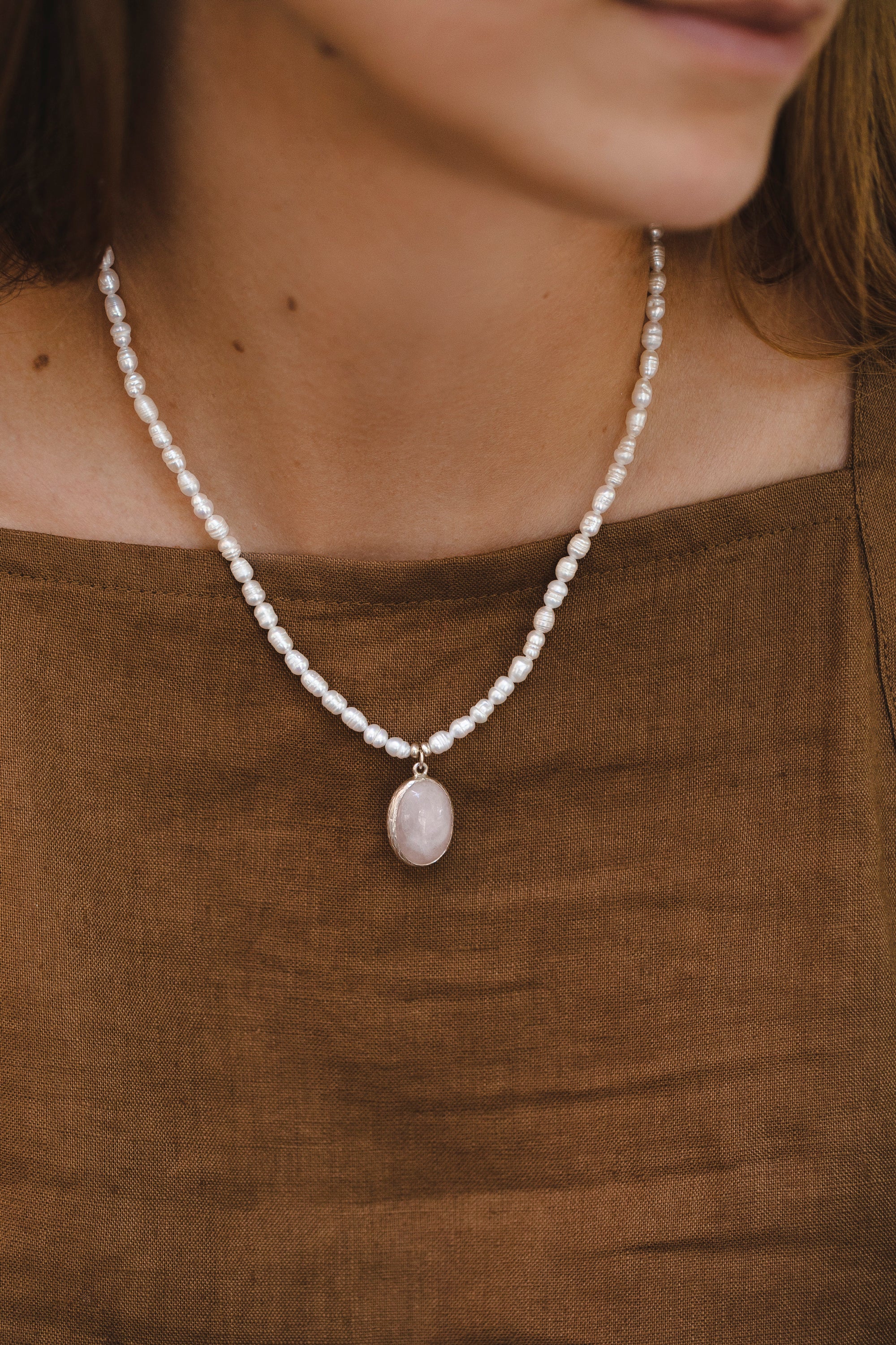 • Natural pearls and natural semiprecious stone — rose quartz