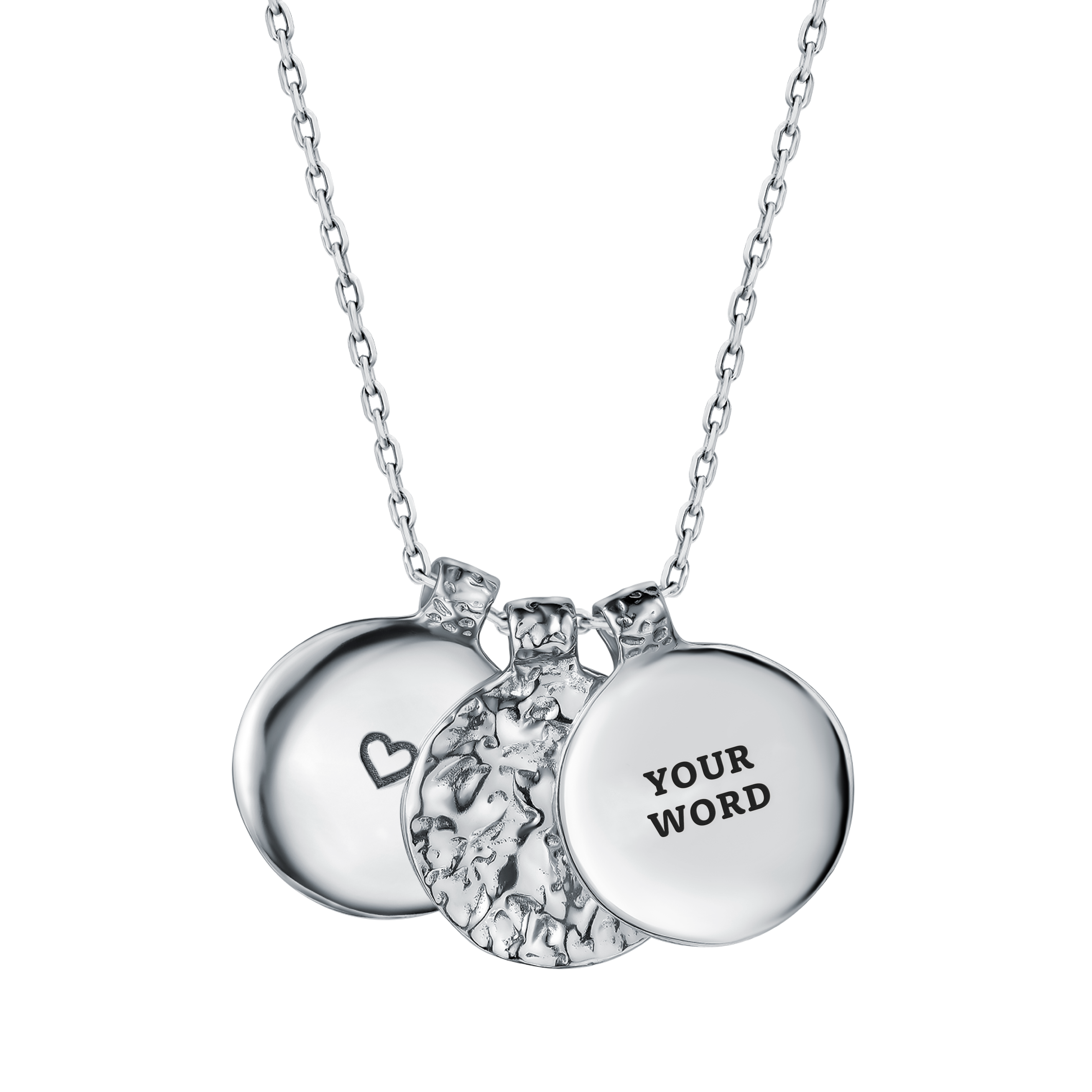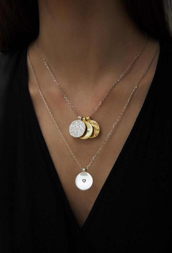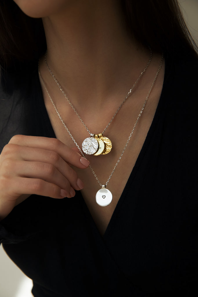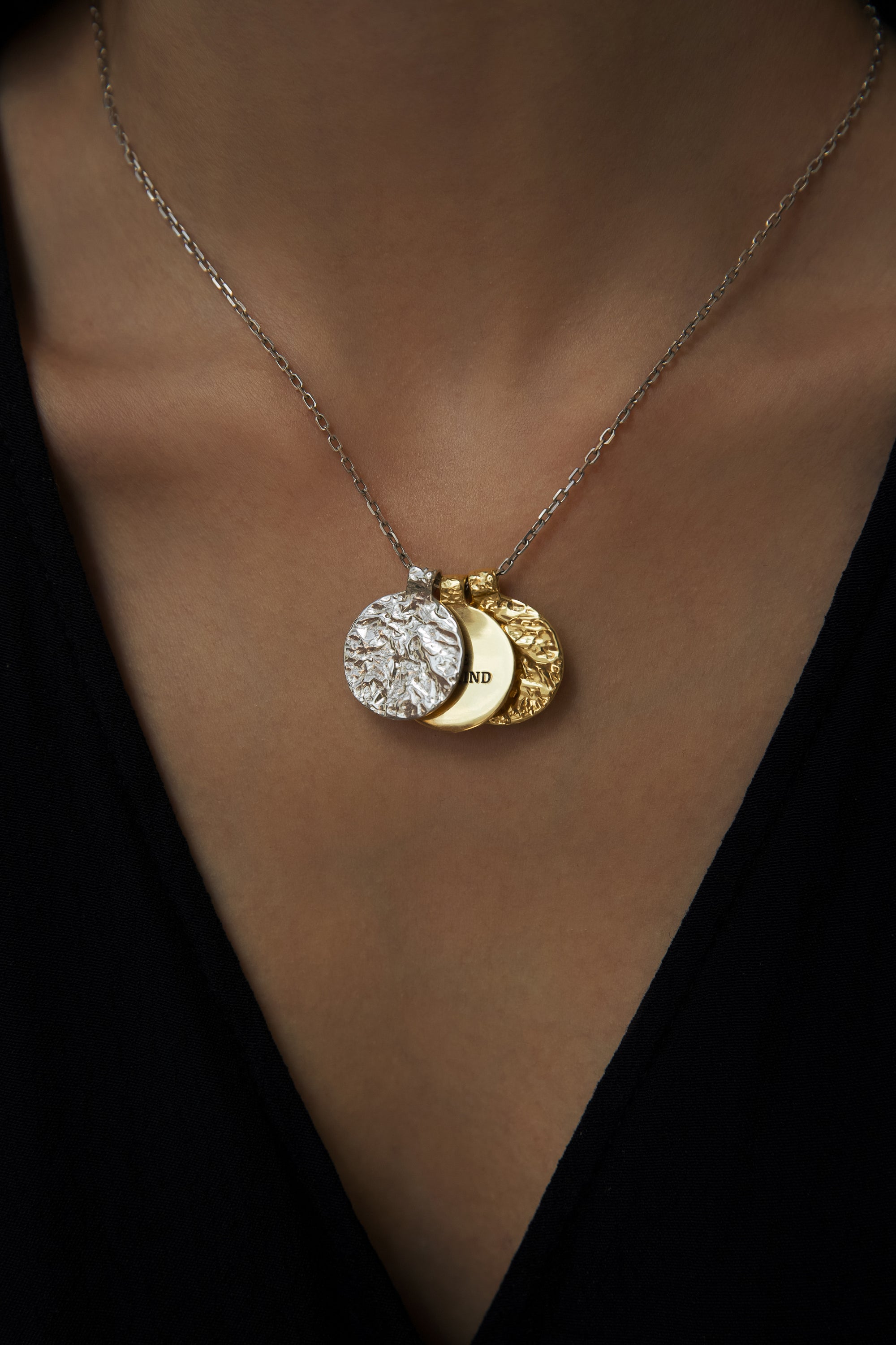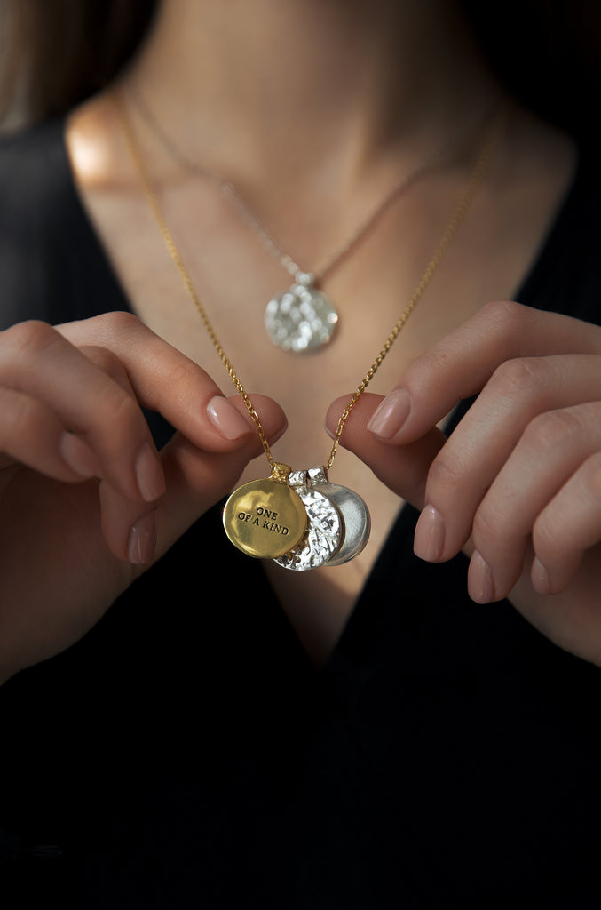 Story Pendant has two sides: one is with a crumpled texture, and the second is smooth and glossy. The second side will bear your inscription, which you can keep close to your heart or show to others — it's up to you!