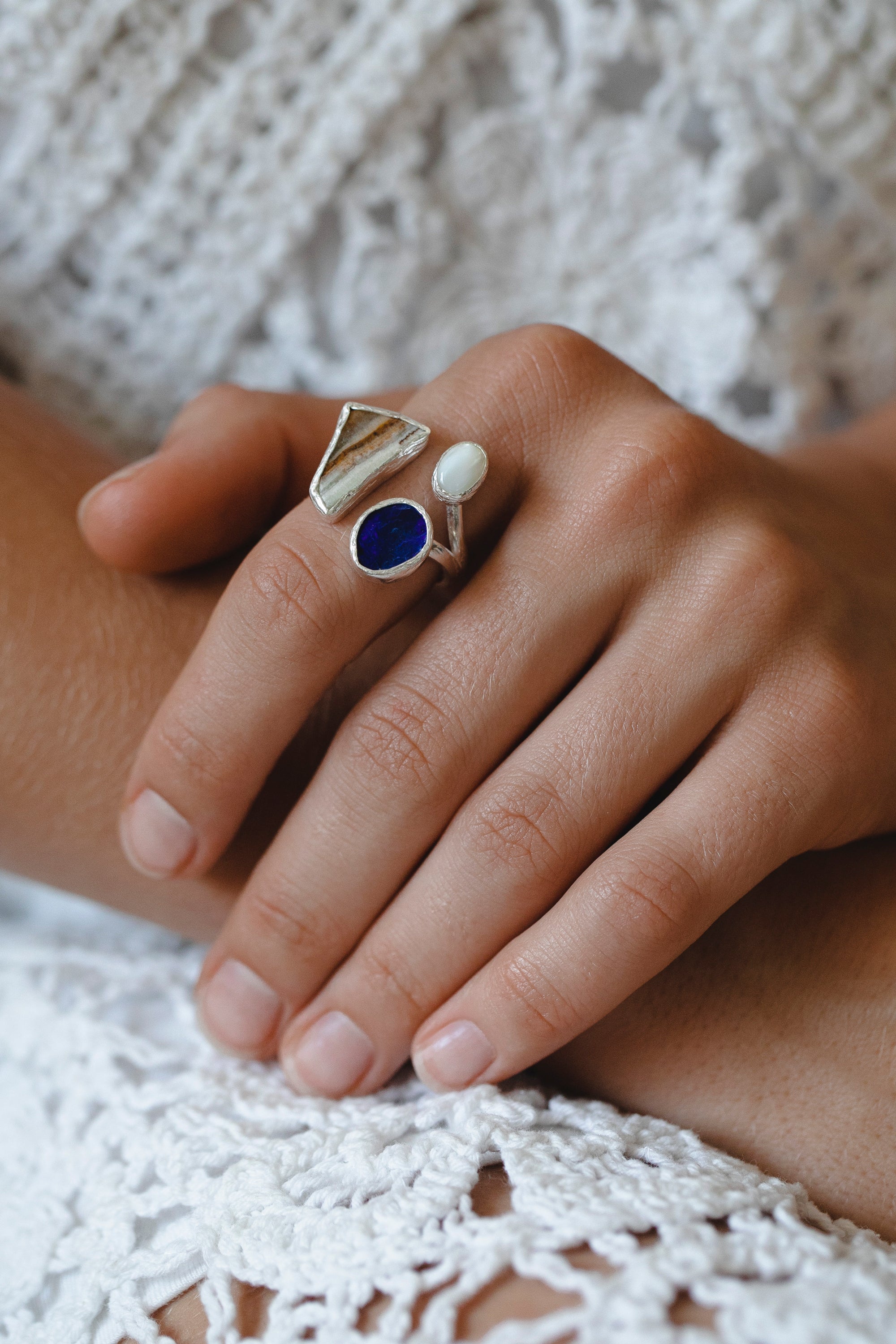 · Ring with natural semiprecious stones — agate and opal — and natural mother of pearl