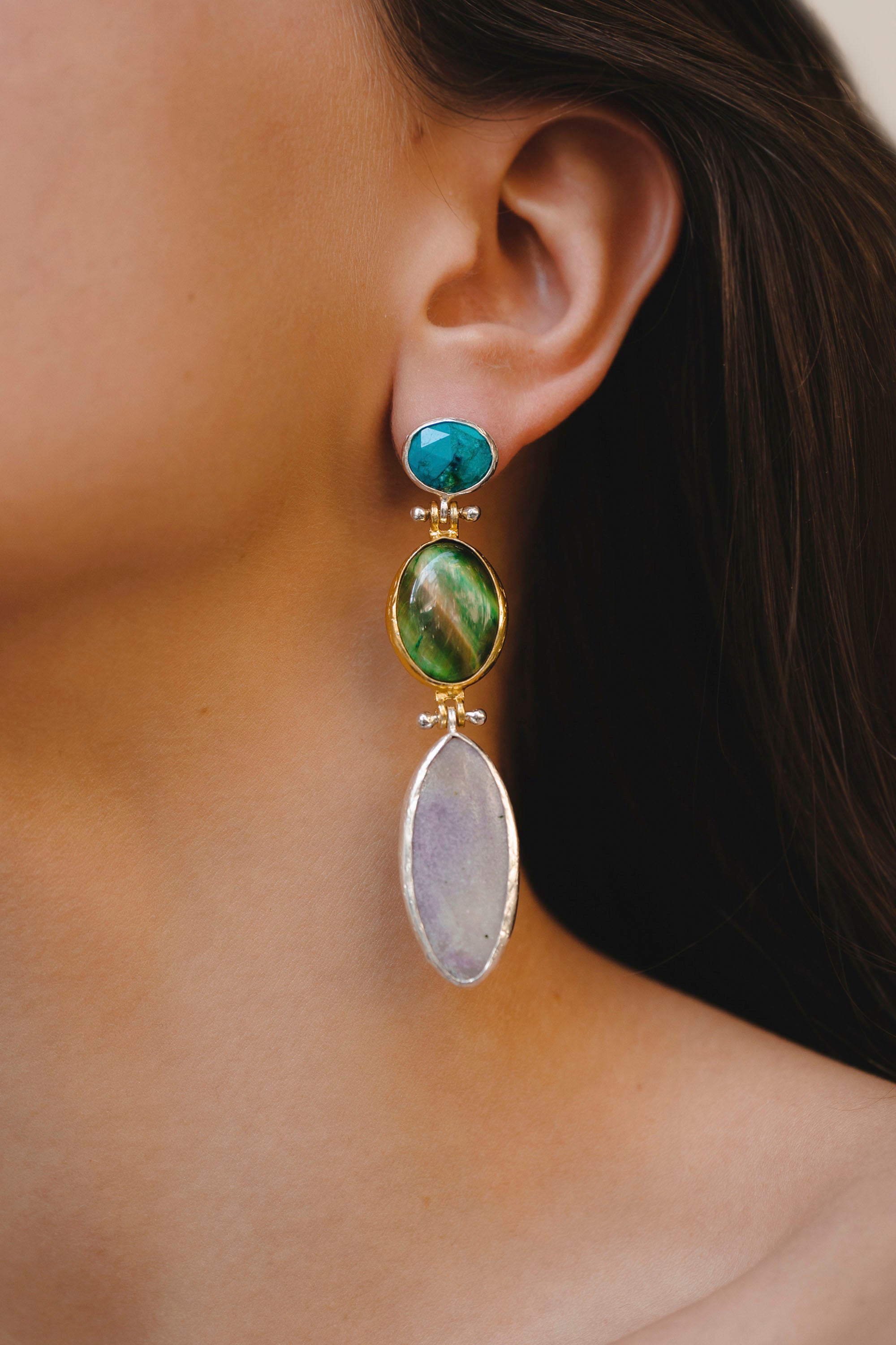 Chrysocolla, Cat's Eye Stone and Hydrogrossular Earrings