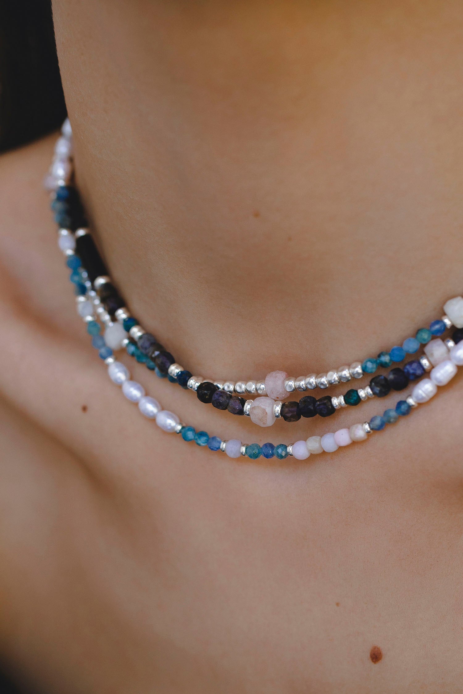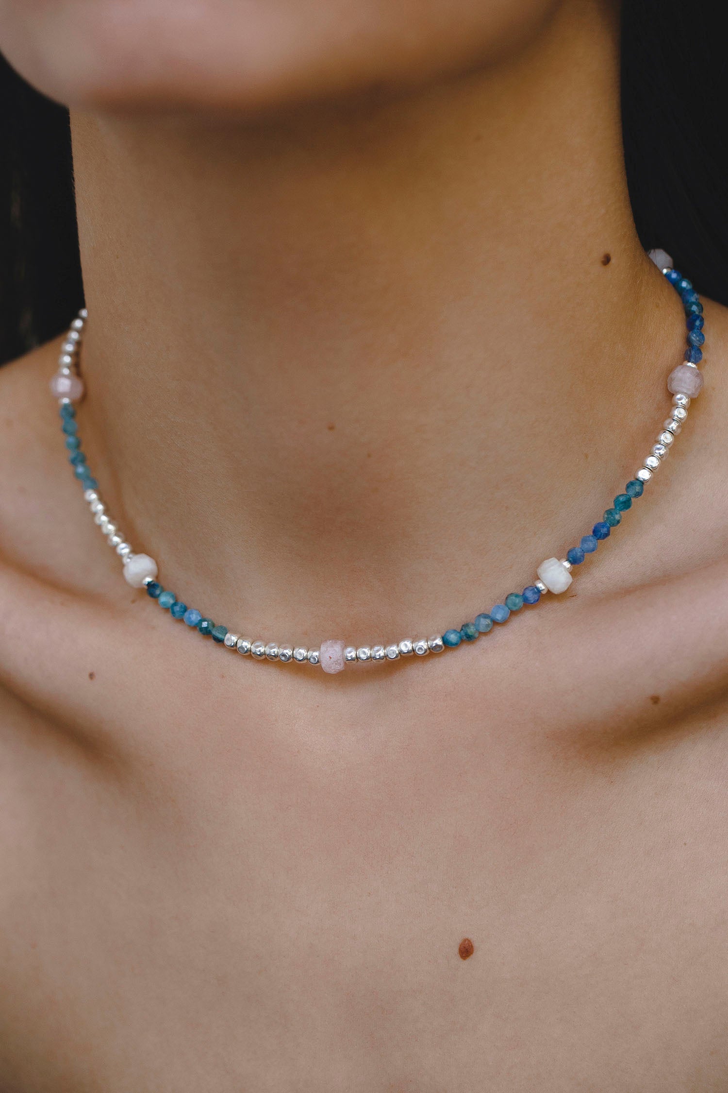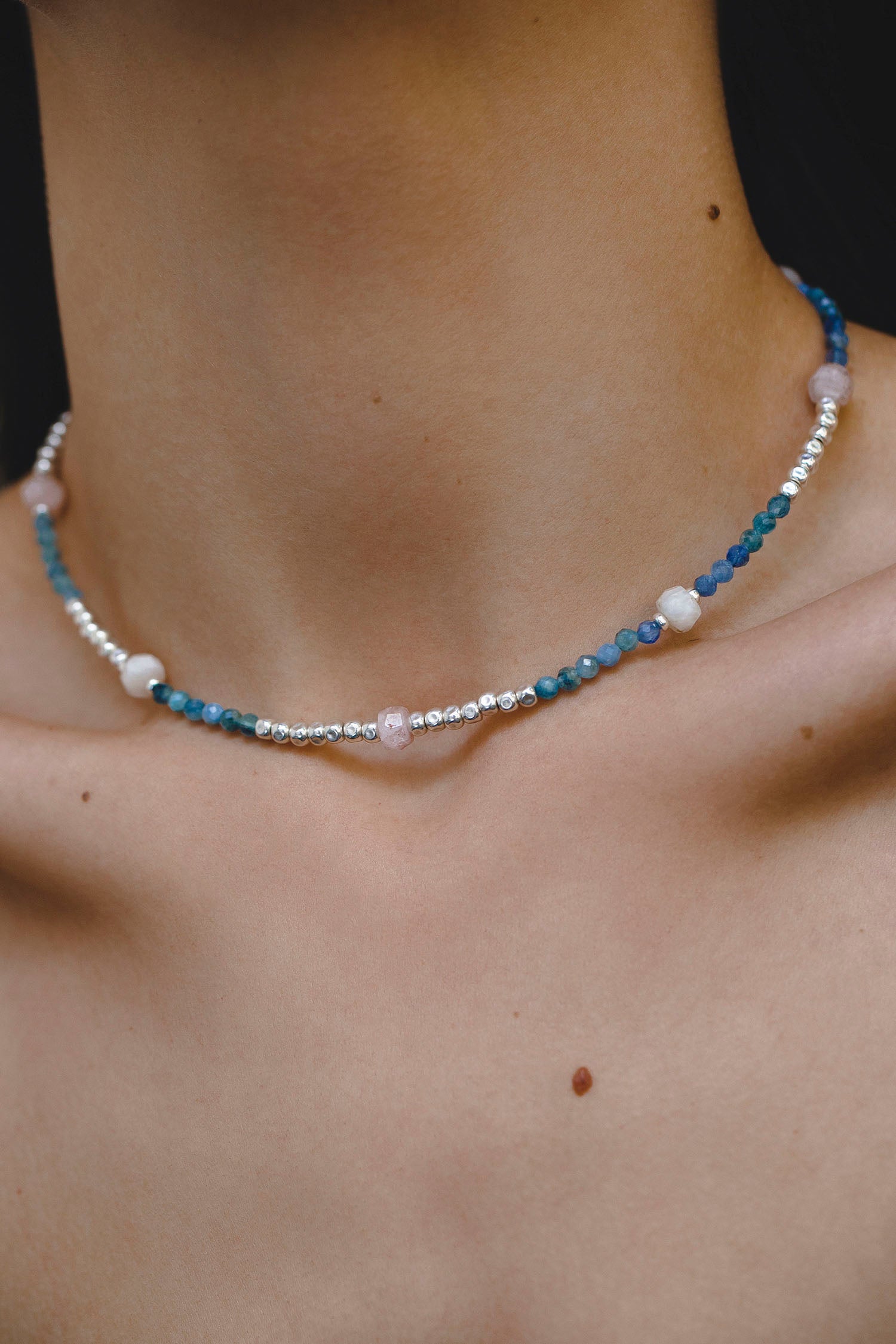 - necklace with natural semiprecious stones — kyanite and opal;