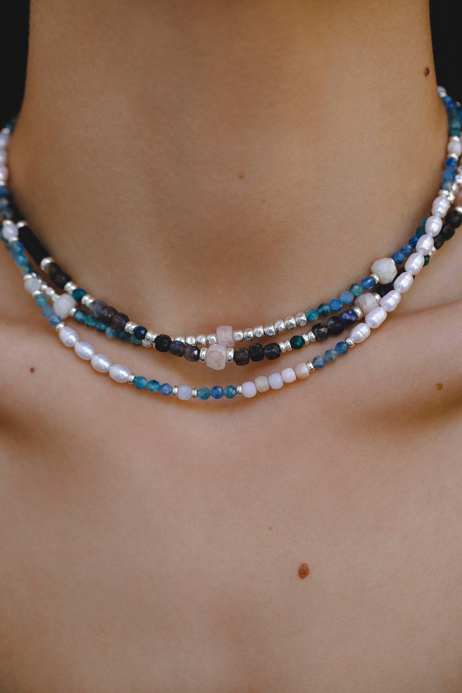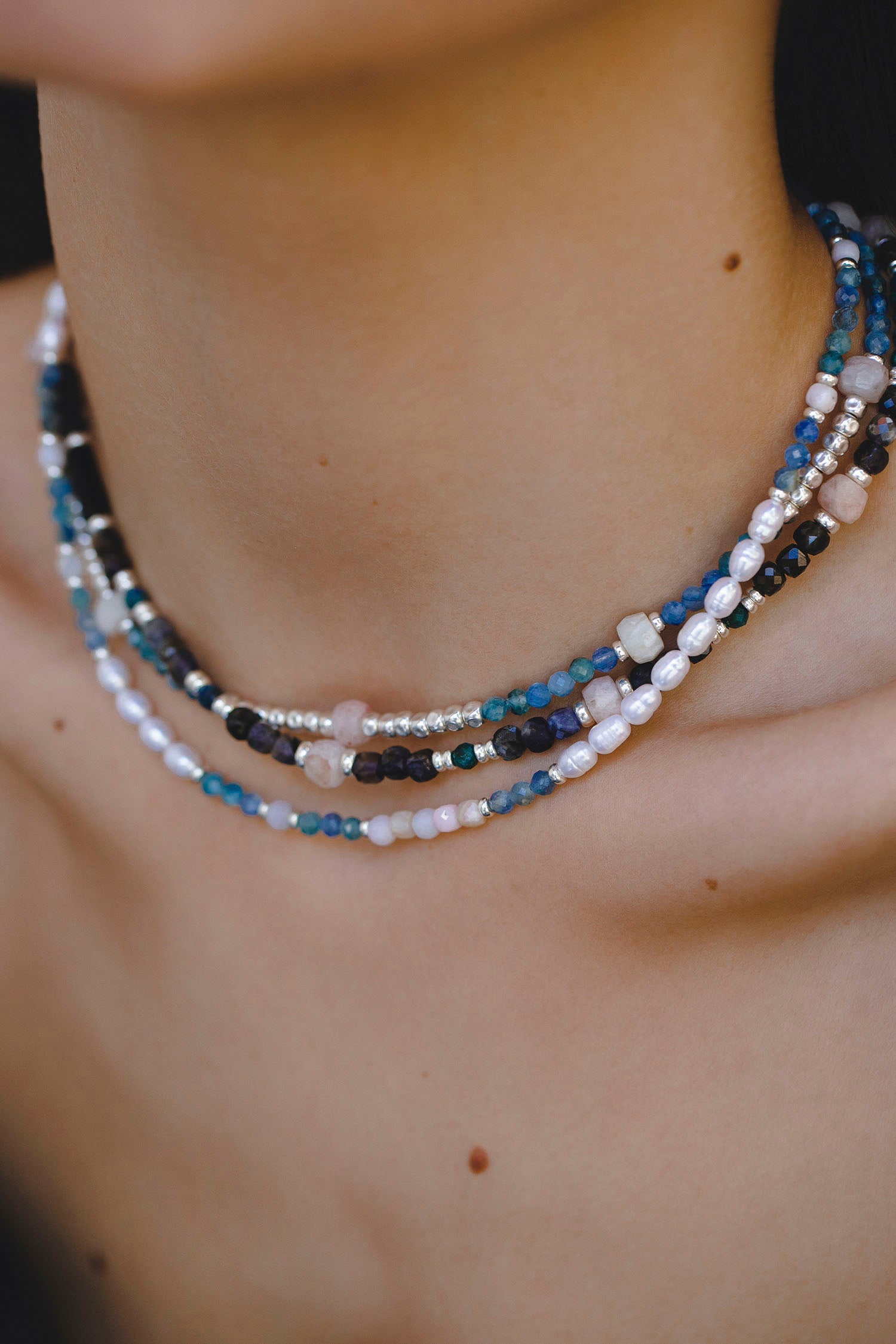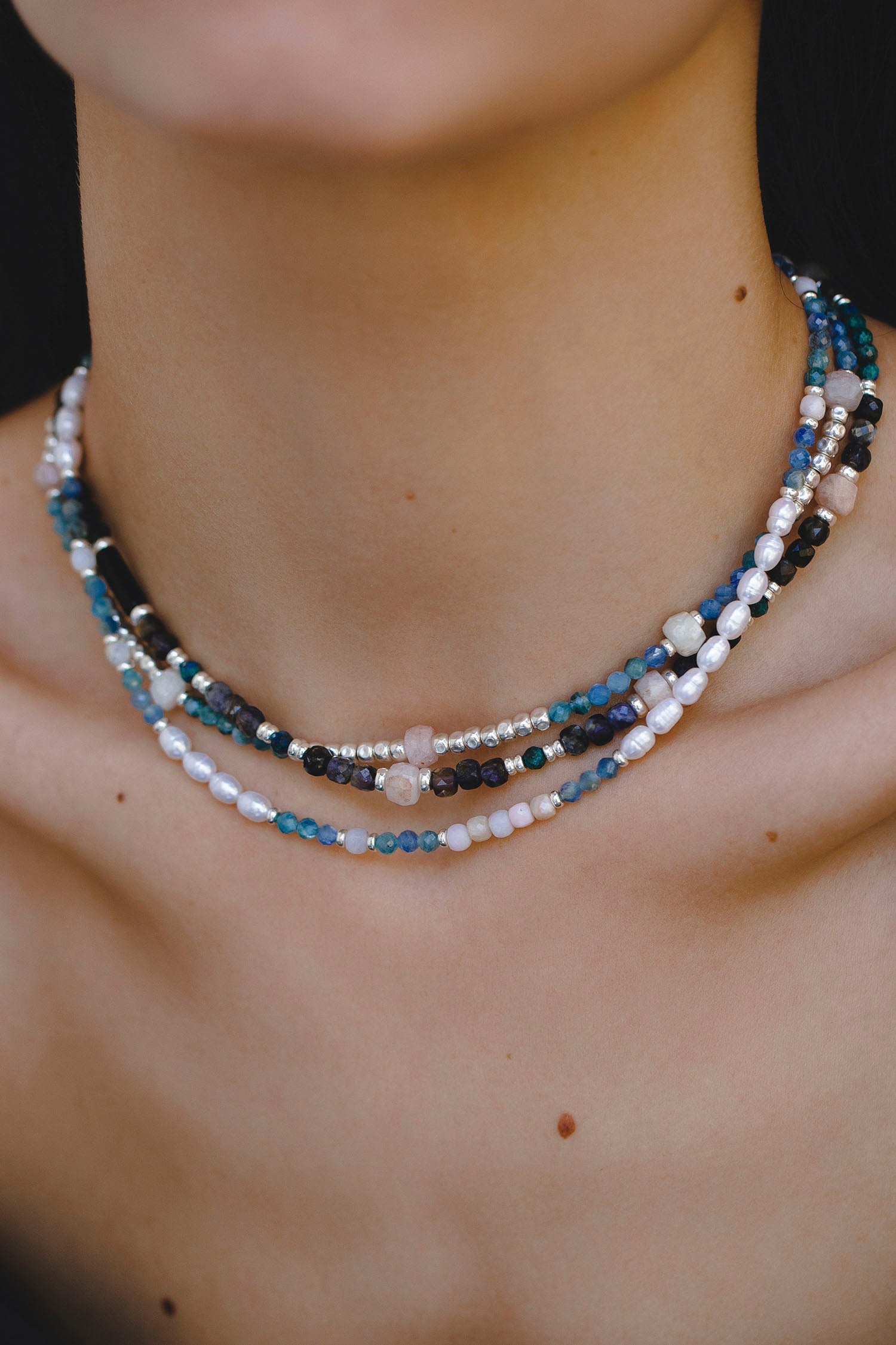 - necklace with natural semiprecious stones — kyanite and opal;
