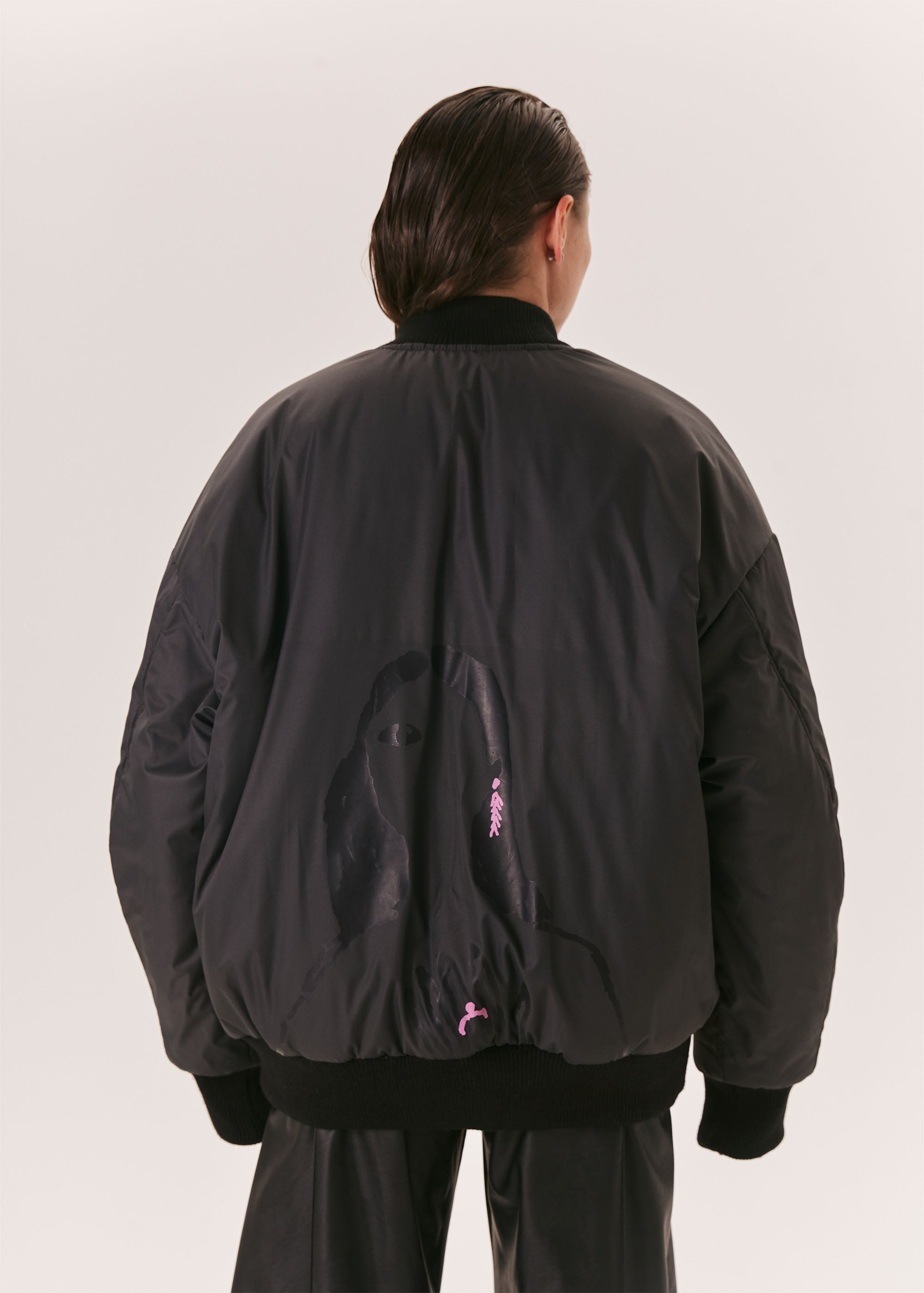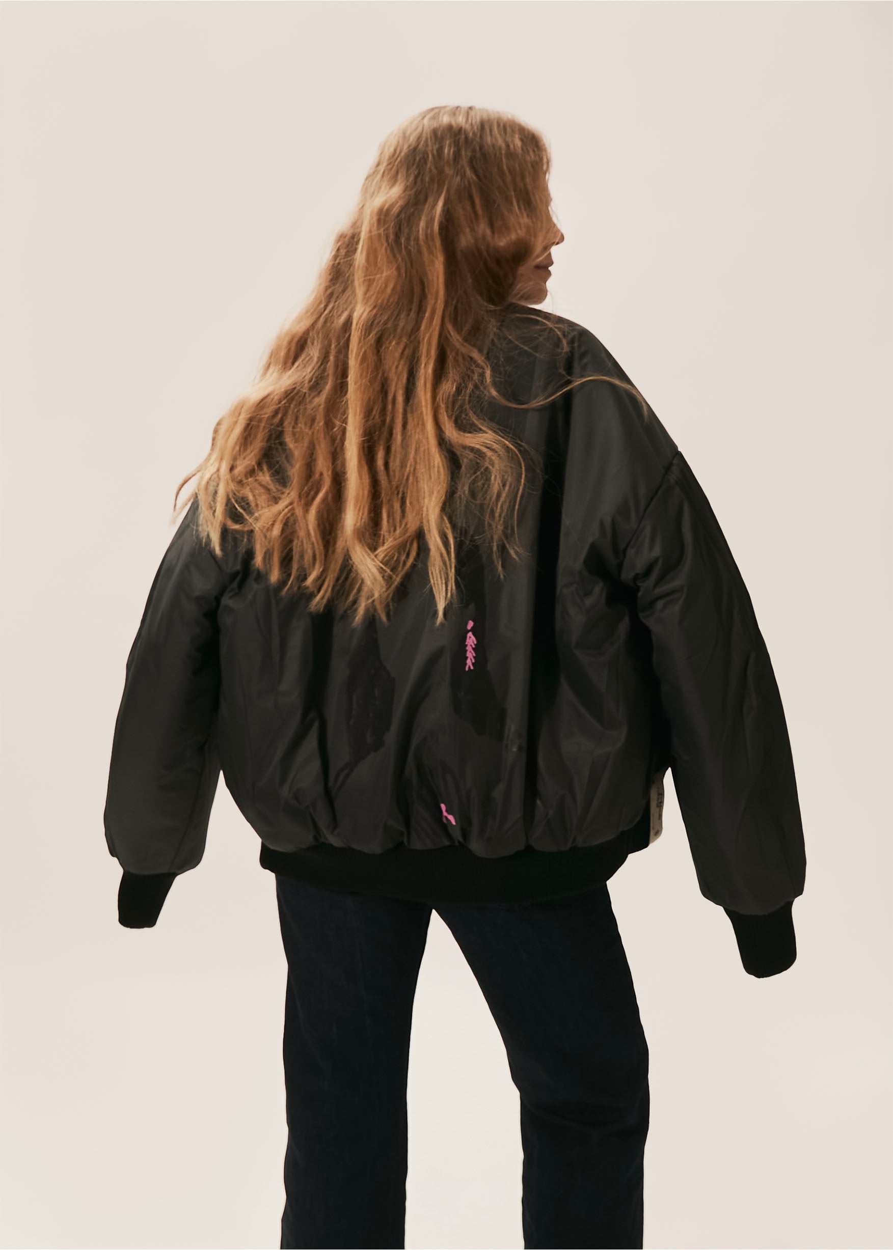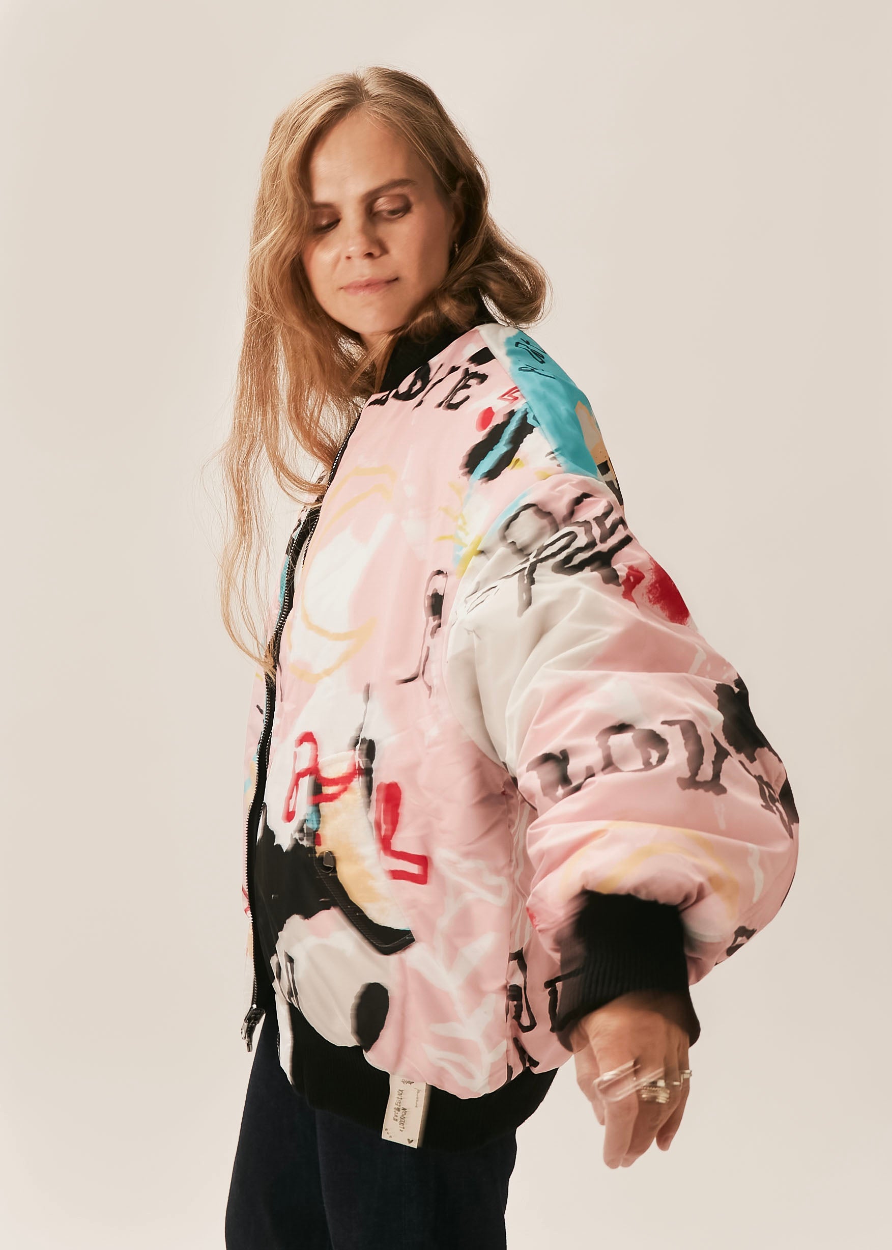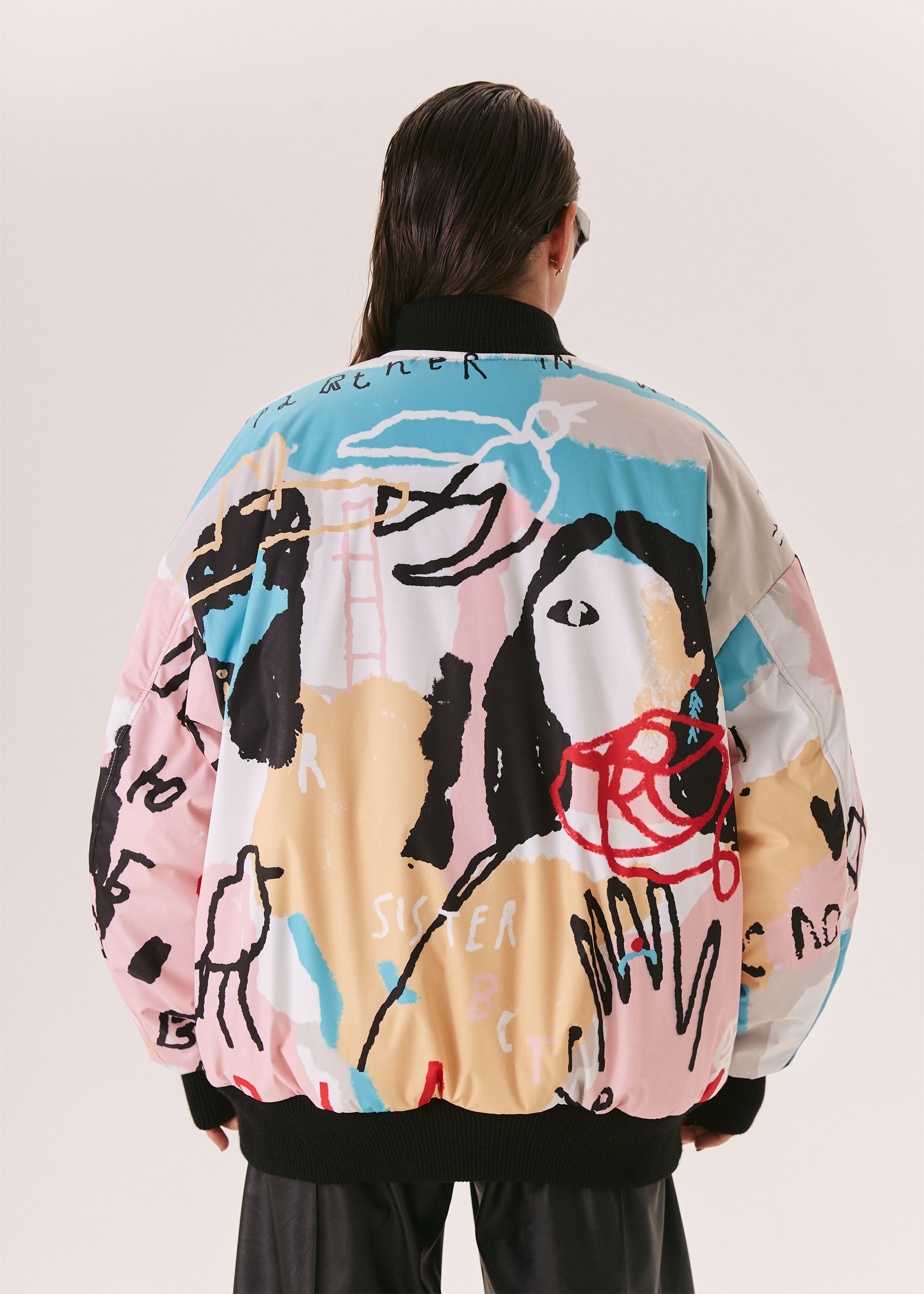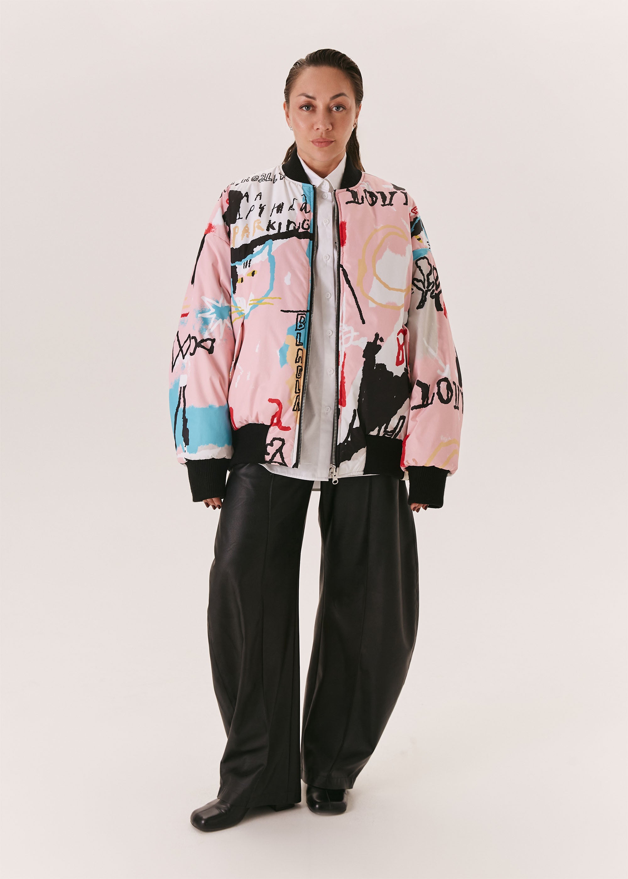 A reversible, insulated bomber with a relaxed fit, made from wind- and water-resistant fabric โ a must-have for your wardrobe. The piece, featuring an exclusive print from the EVE&ESTHER x LIBERMAN collaboration, adds a unique touch to your look.
