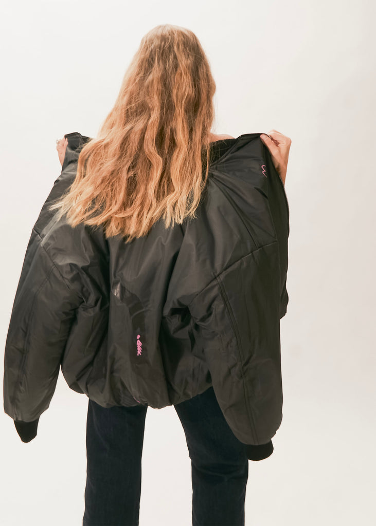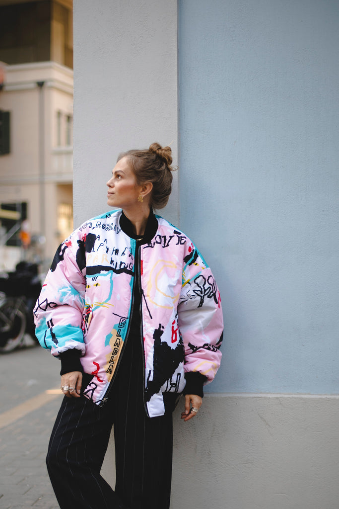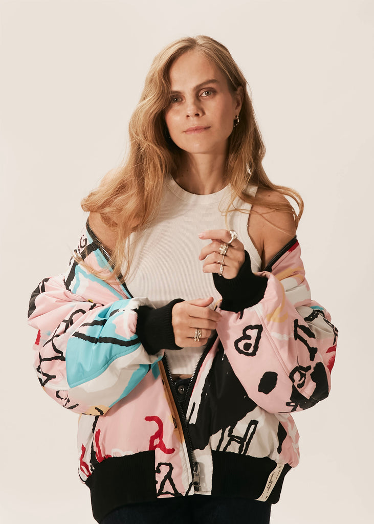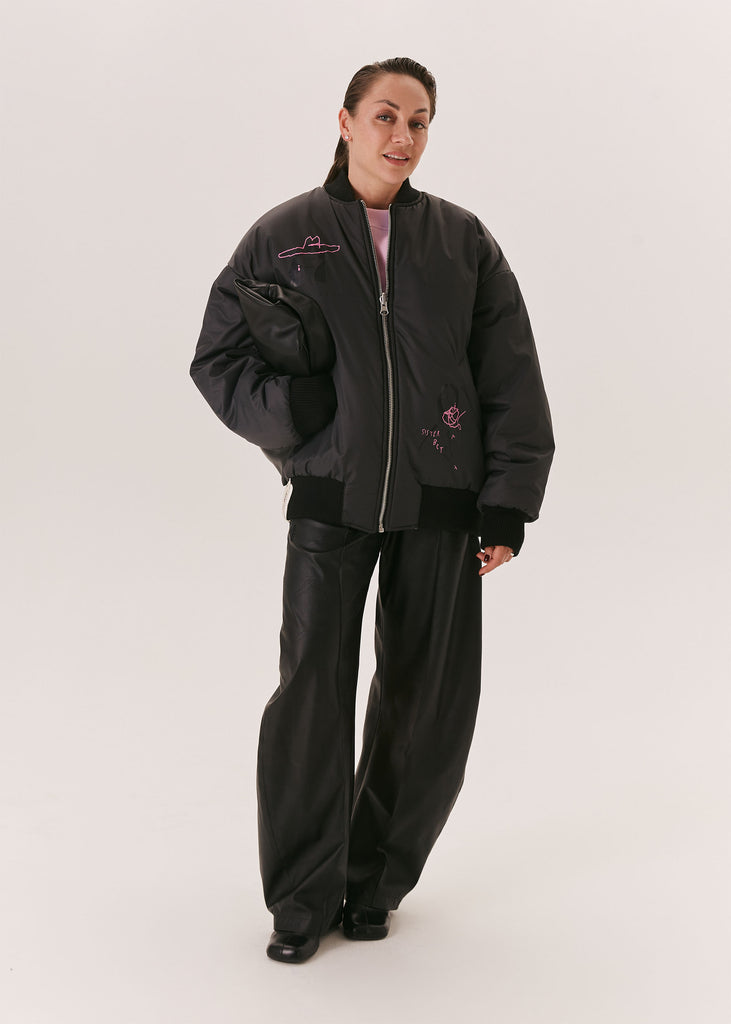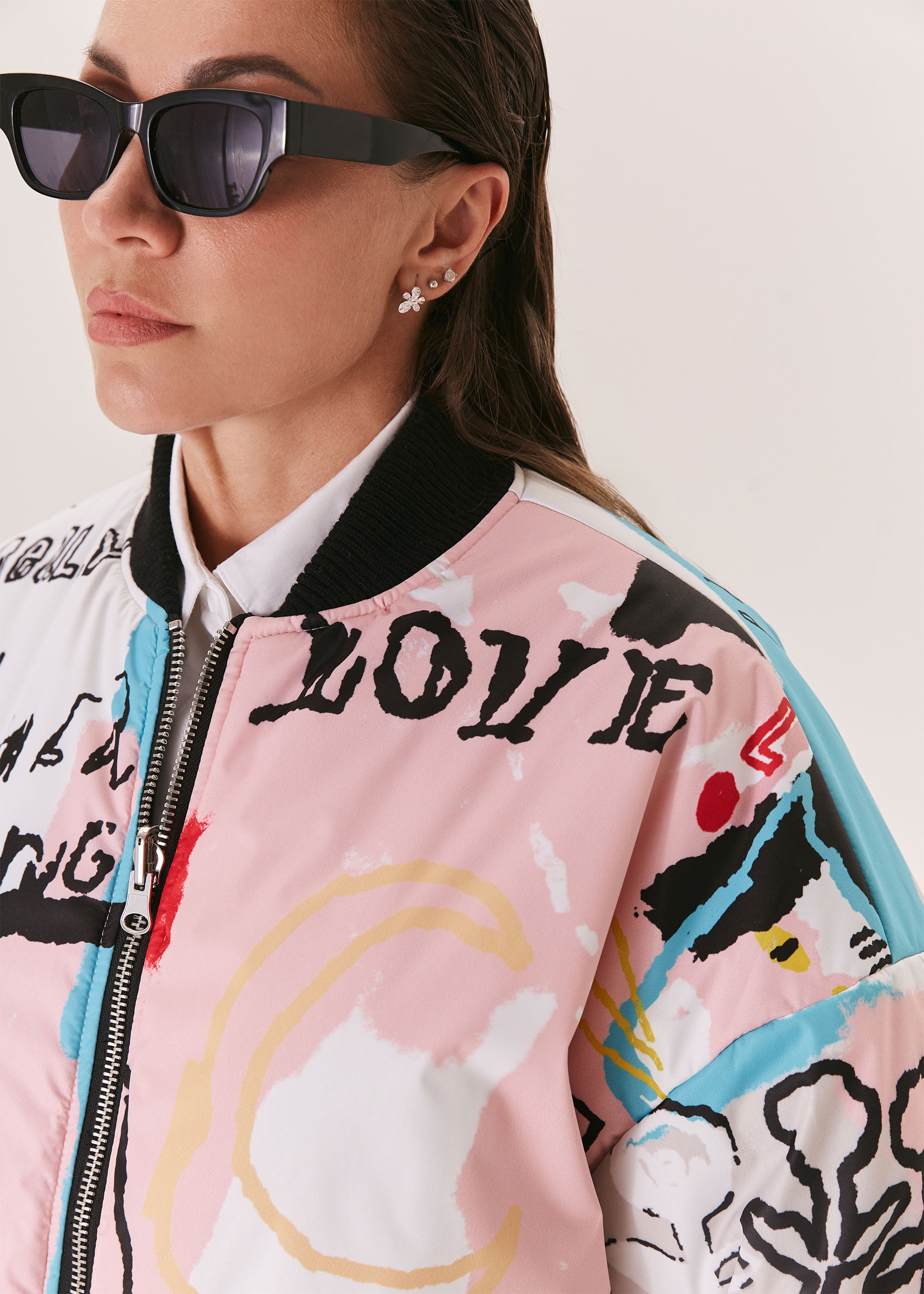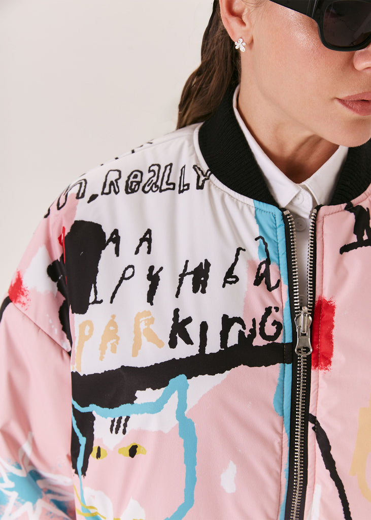 A reversible, insulated bomber with a relaxed fit, made from wind- and water-resistant fabric โ a must-have for your wardrobe. The piece, featuring an exclusive print from the EVE&ESTHER x LIBERMAN collaboration, adds a unique touch to your look.