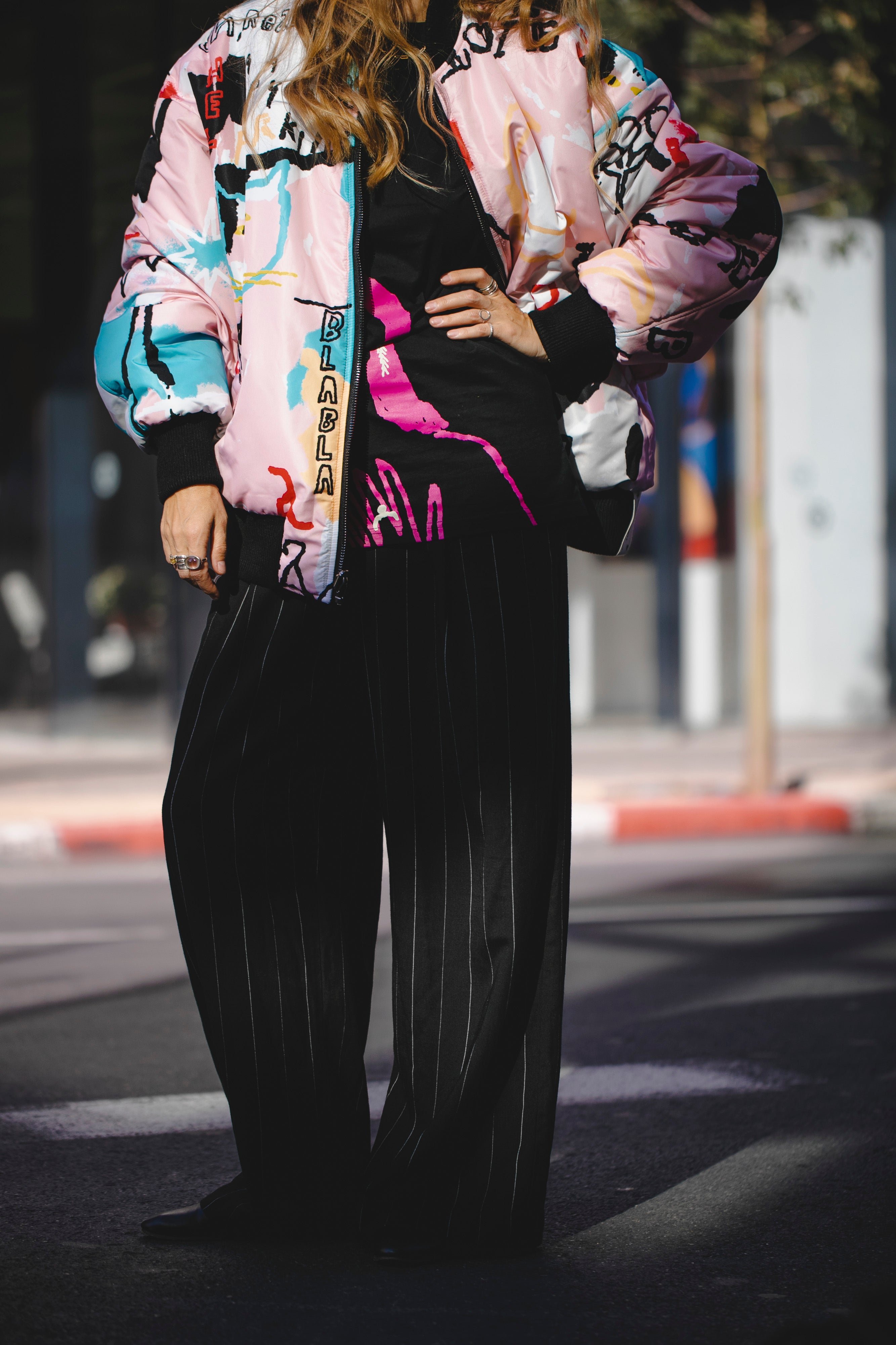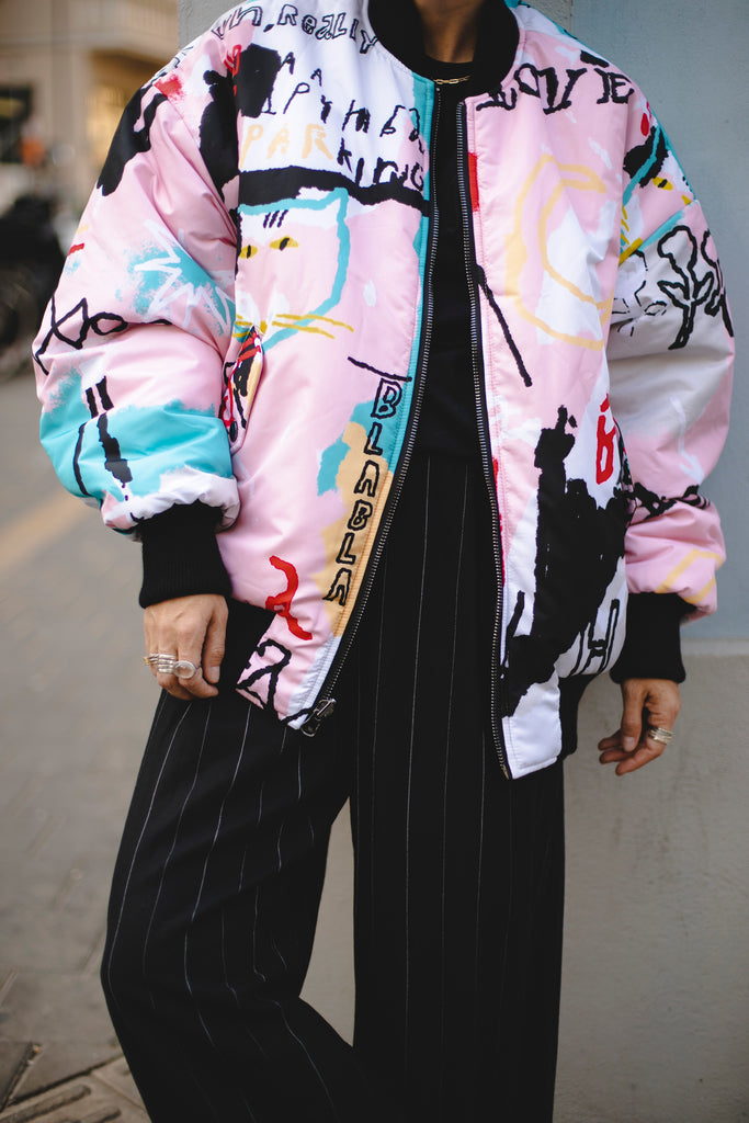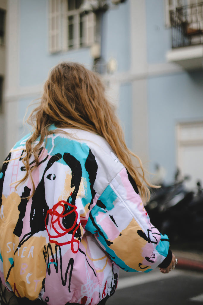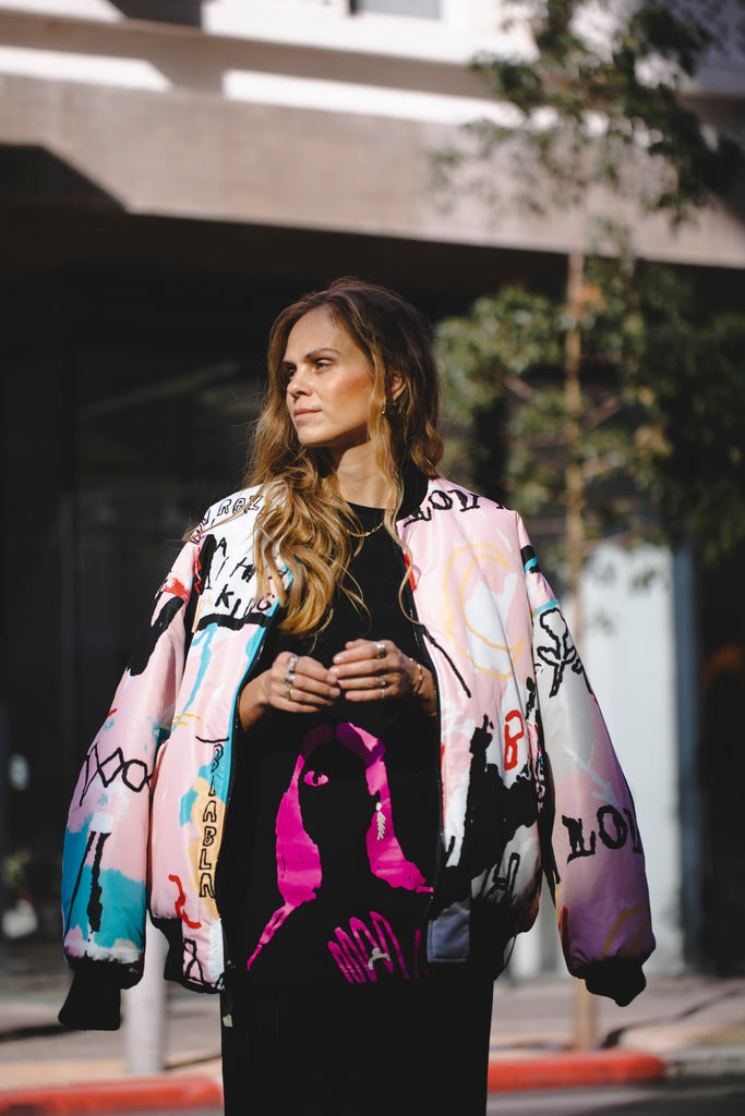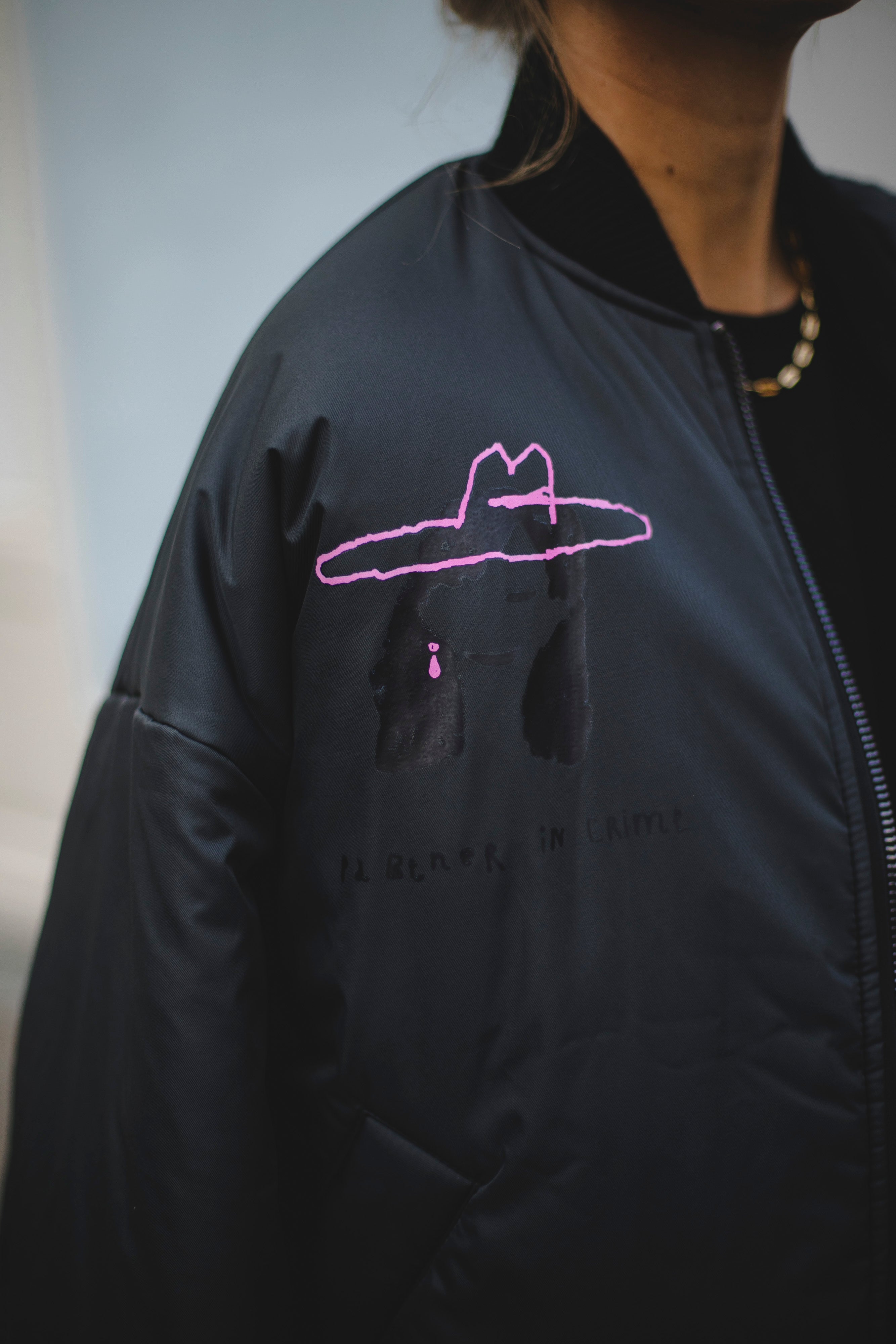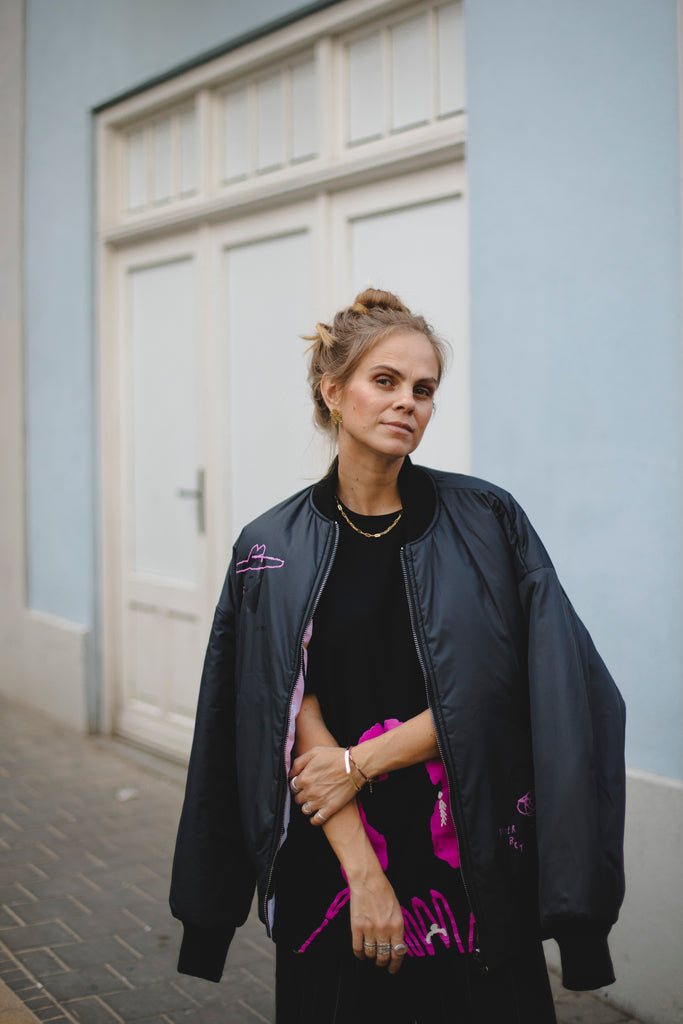 A reversible, insulated bomber with a relaxed fit, made from wind- and water-resistant fabric โ a must-have for your wardrobe. The piece, featuring an exclusive print from the EVE&ESTHER x LIBERMAN collaboration, adds a unique touch to your look.