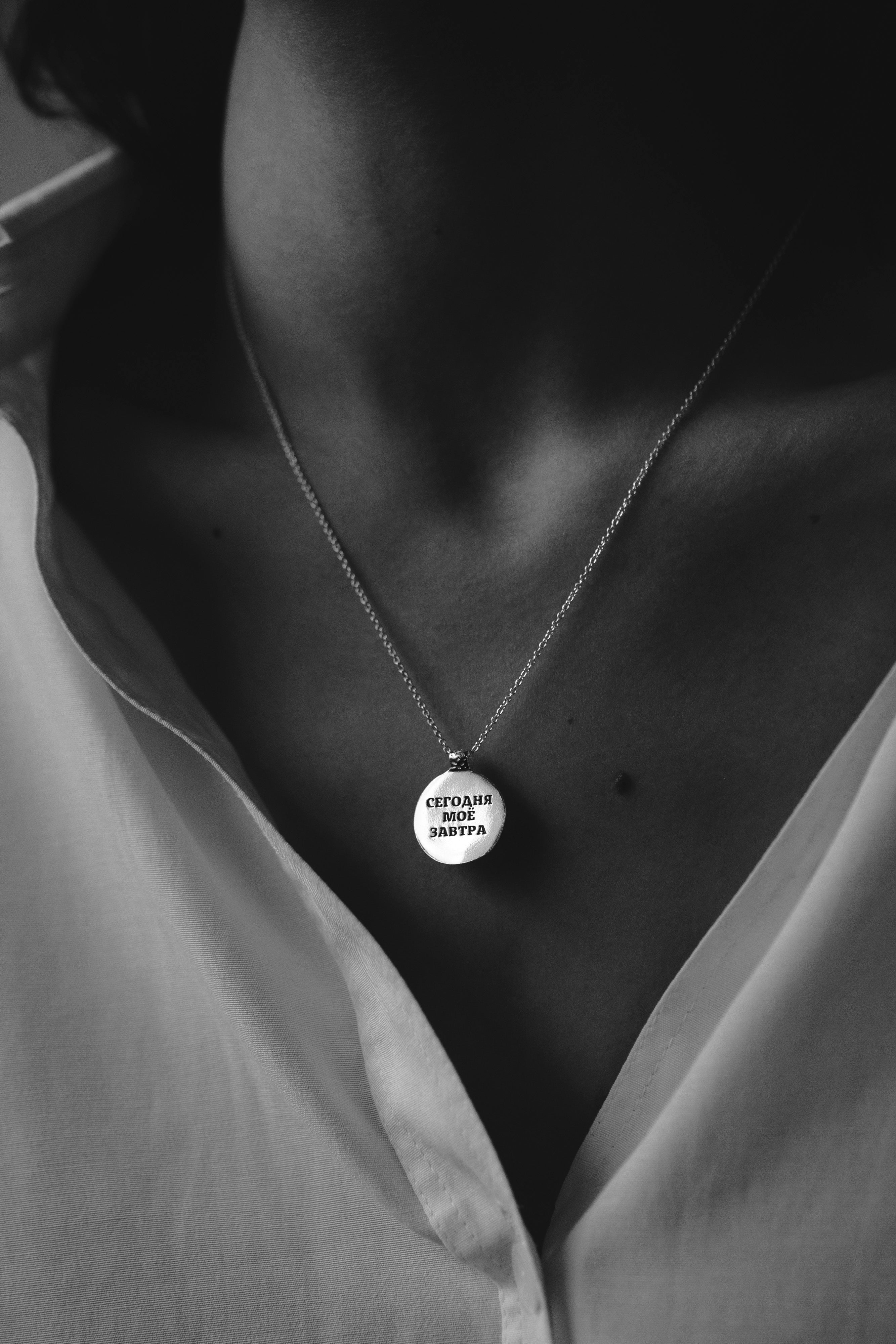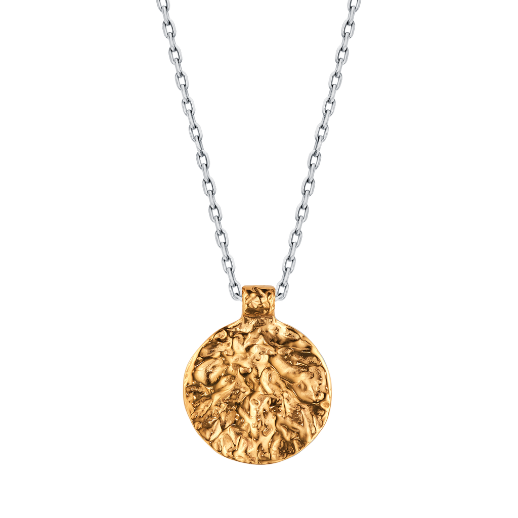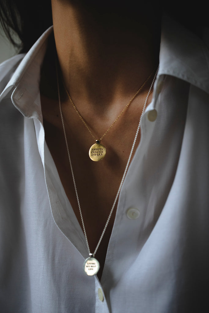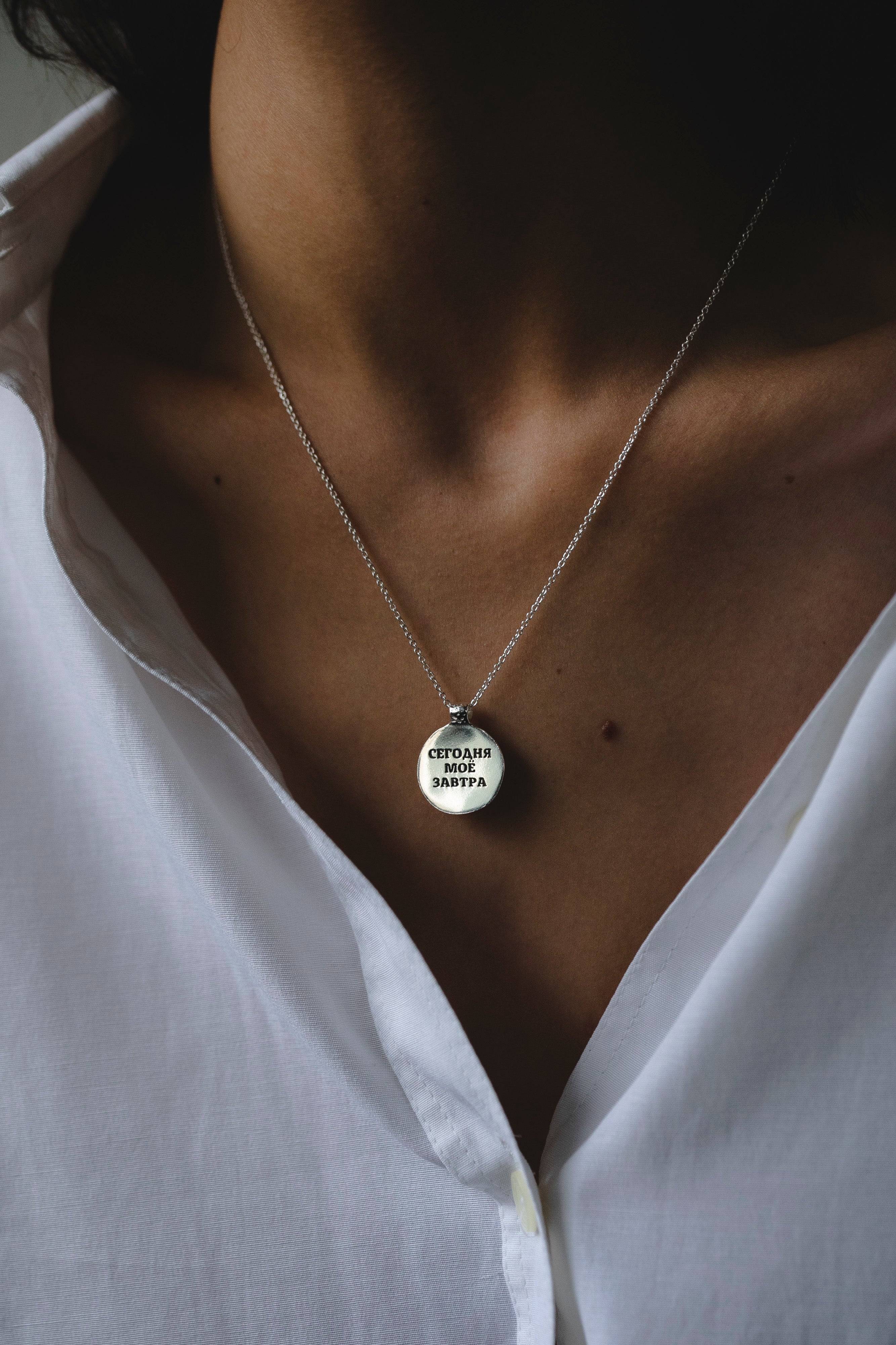 Story Pendant has two sides: one is with a crumpled texture, and the second is smooth and glossy. The second side will bear your inscription, which you can keep close to your heart or show to others — it's up to you!